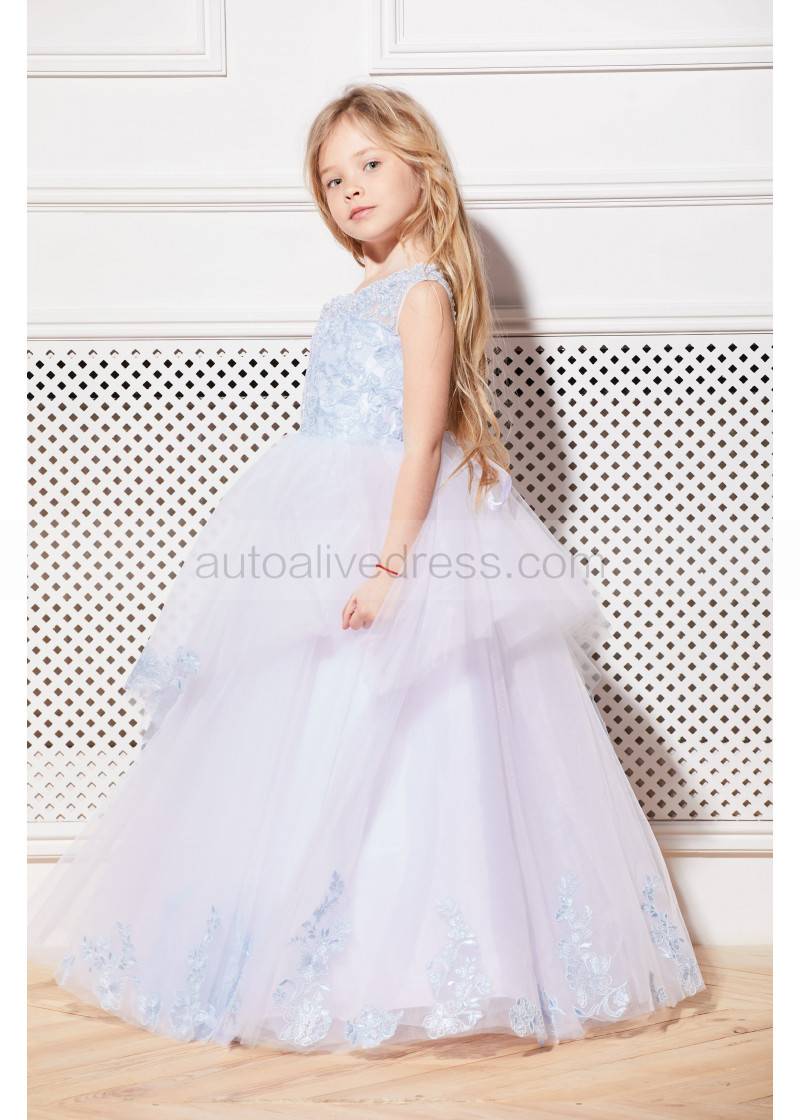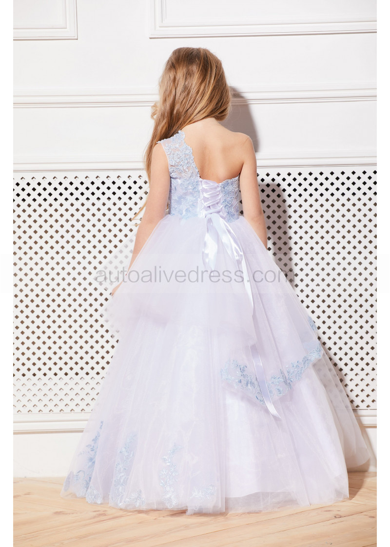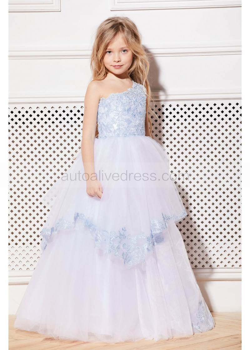 One Shoulder Light Blue Lace Tulle Dreamy Flower Girl Dress