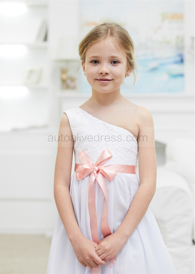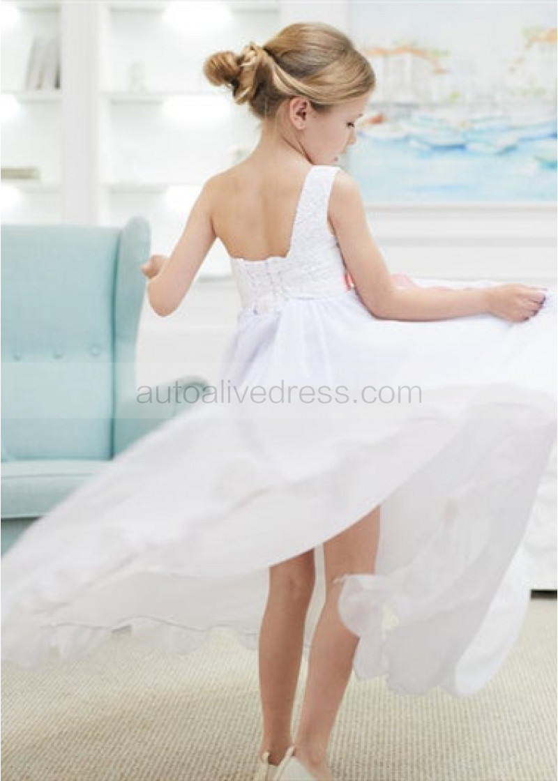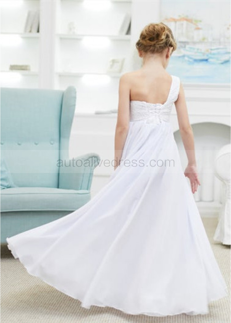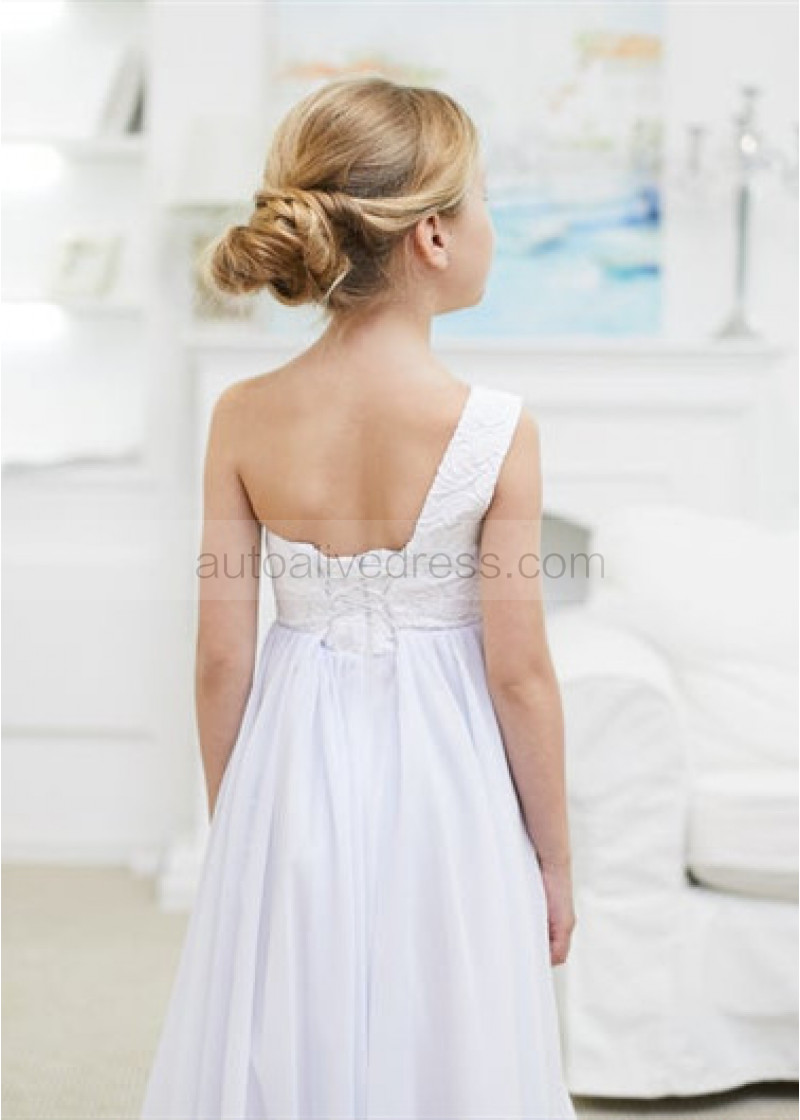 One Shoulder White Lace Chiffon Long Flower Girl Dress