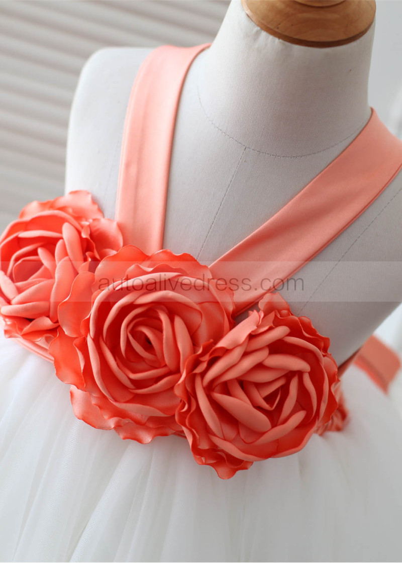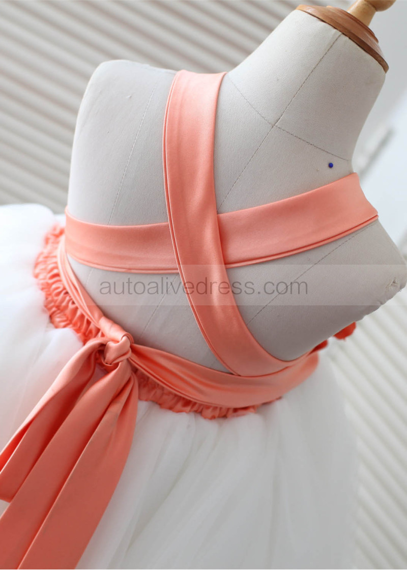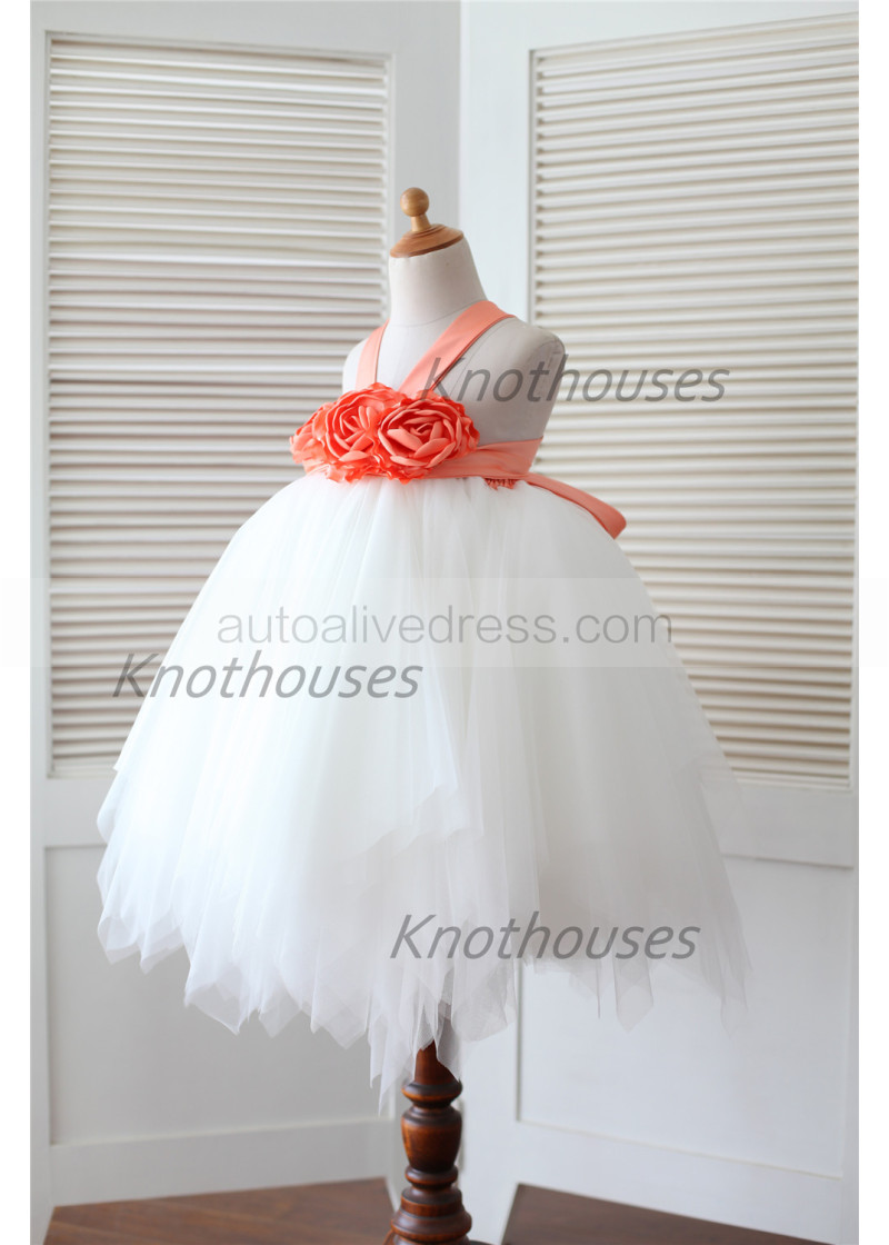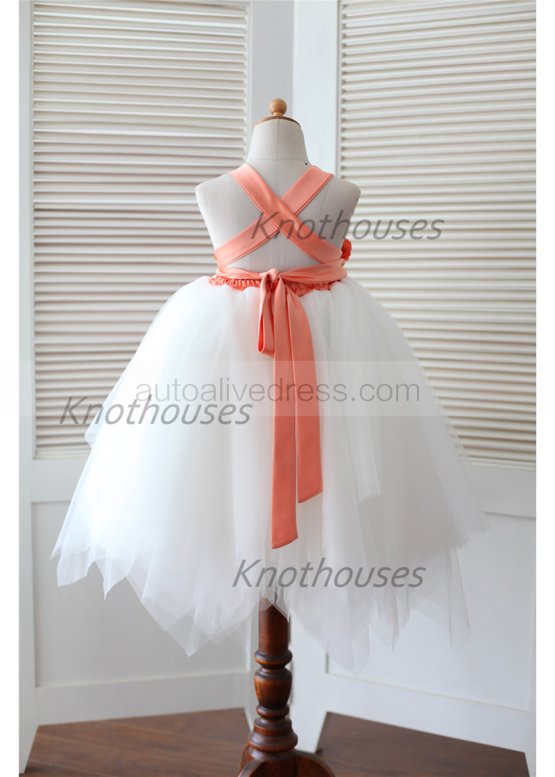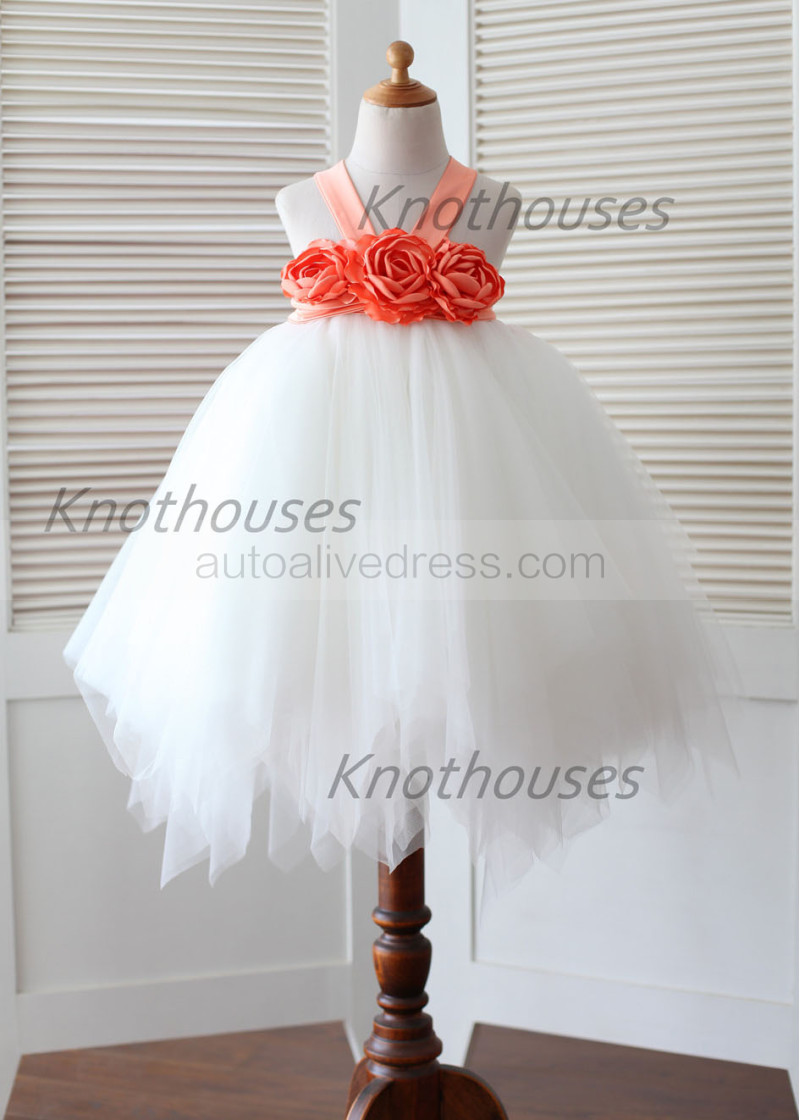 Orange Flowers Ivory Tulle Handkerchief Hem Romantic Flower Girl Dress