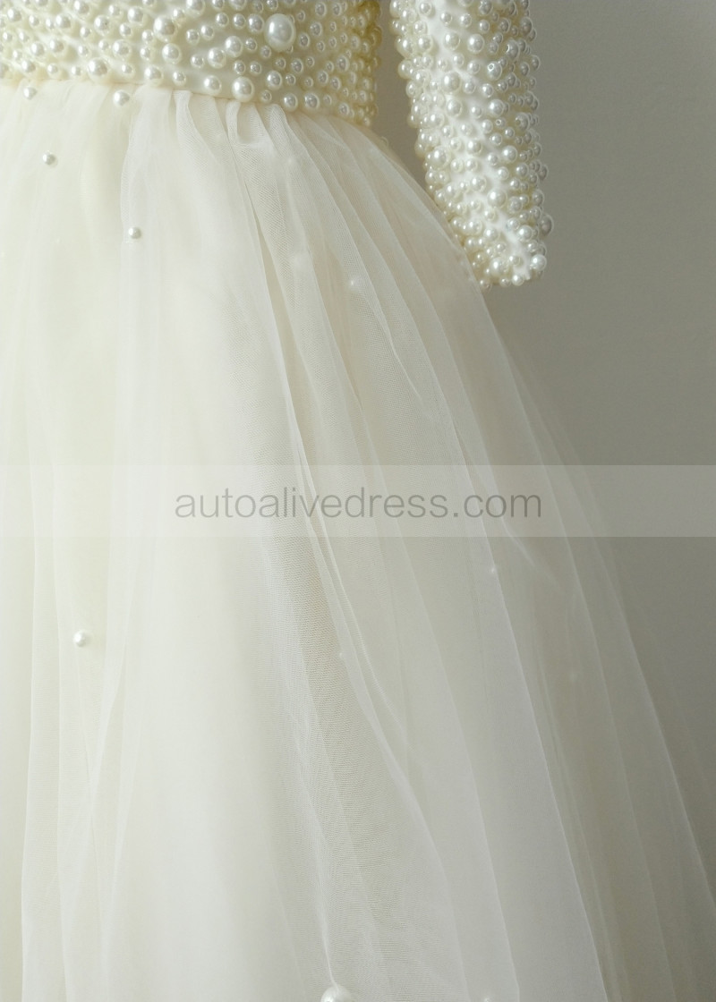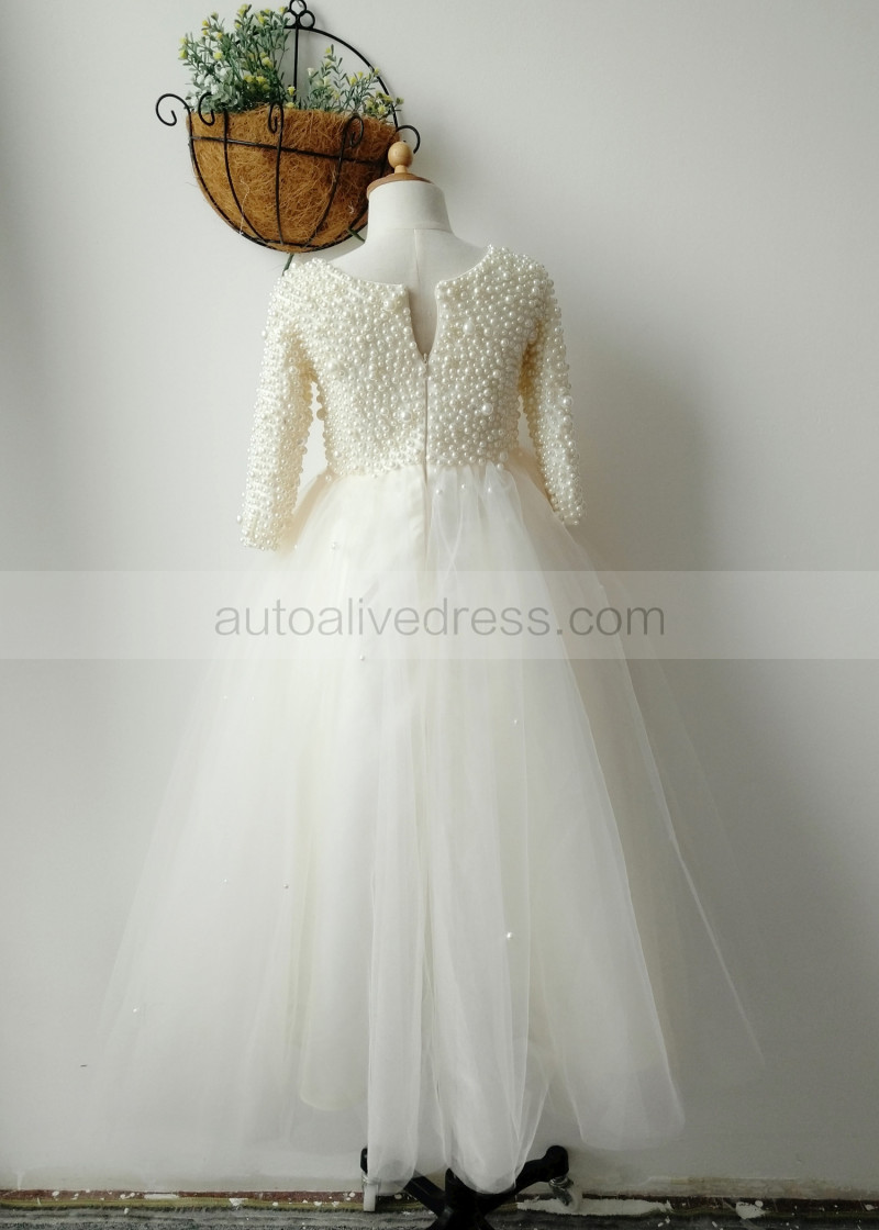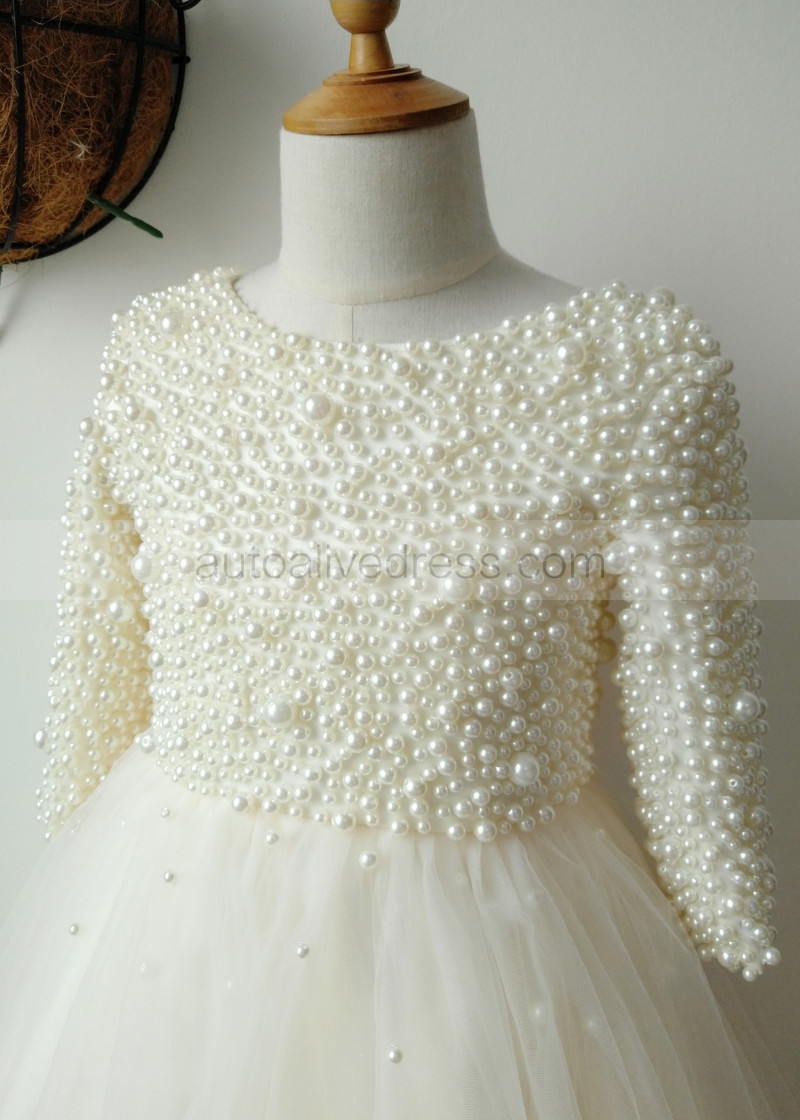 Pearl Beaded Champagne Tulle Floor Length Flower Girl Dress