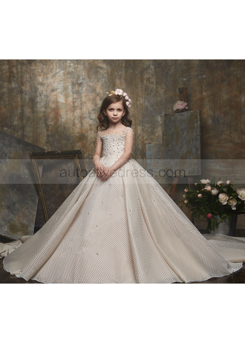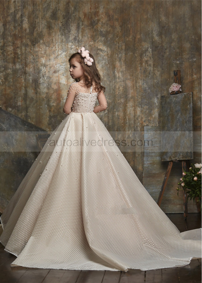 Pearl Beaded Lattice Lace Tulle Floor Length Flower Girl Dress