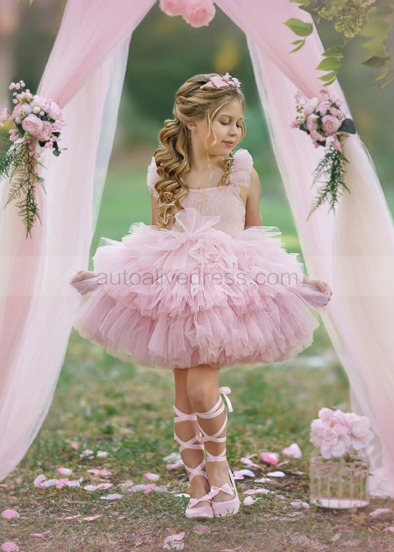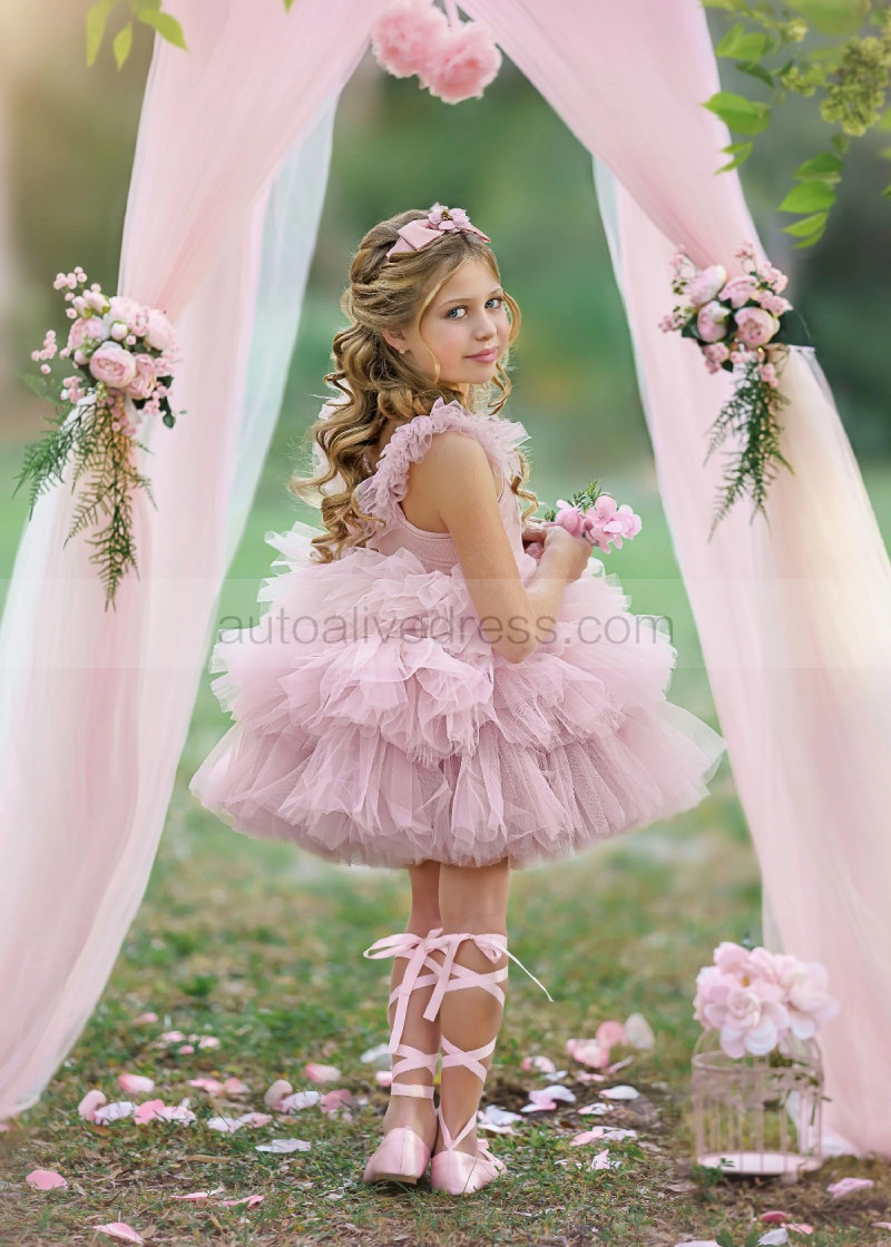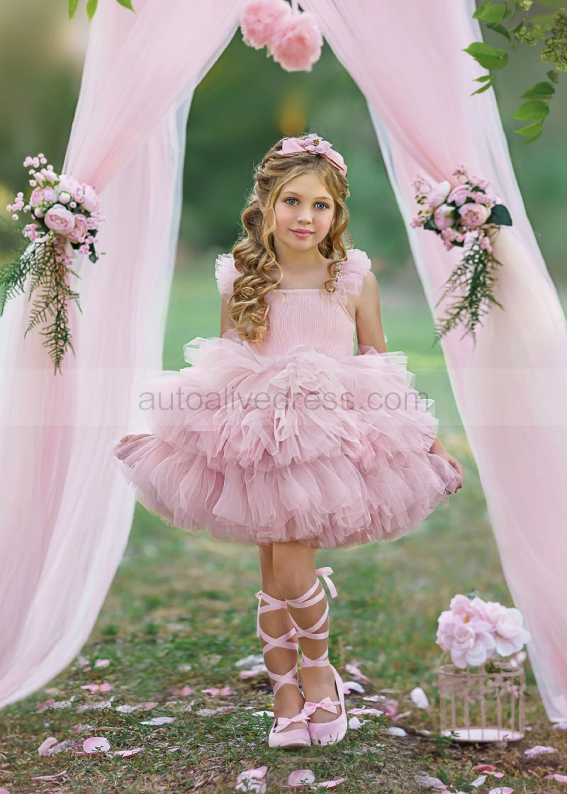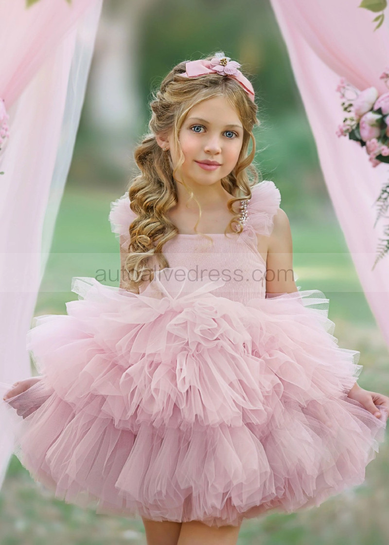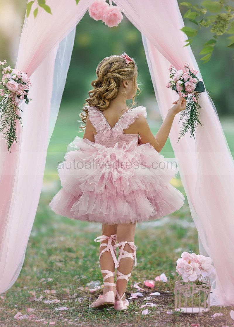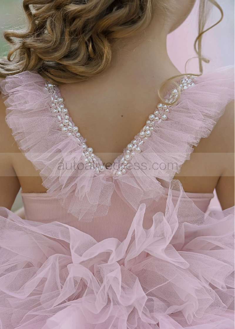 Pearl Beaded Pink Tulle Tiered Flower Girl Dress