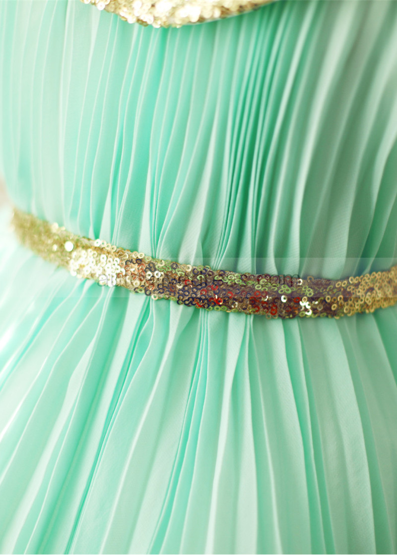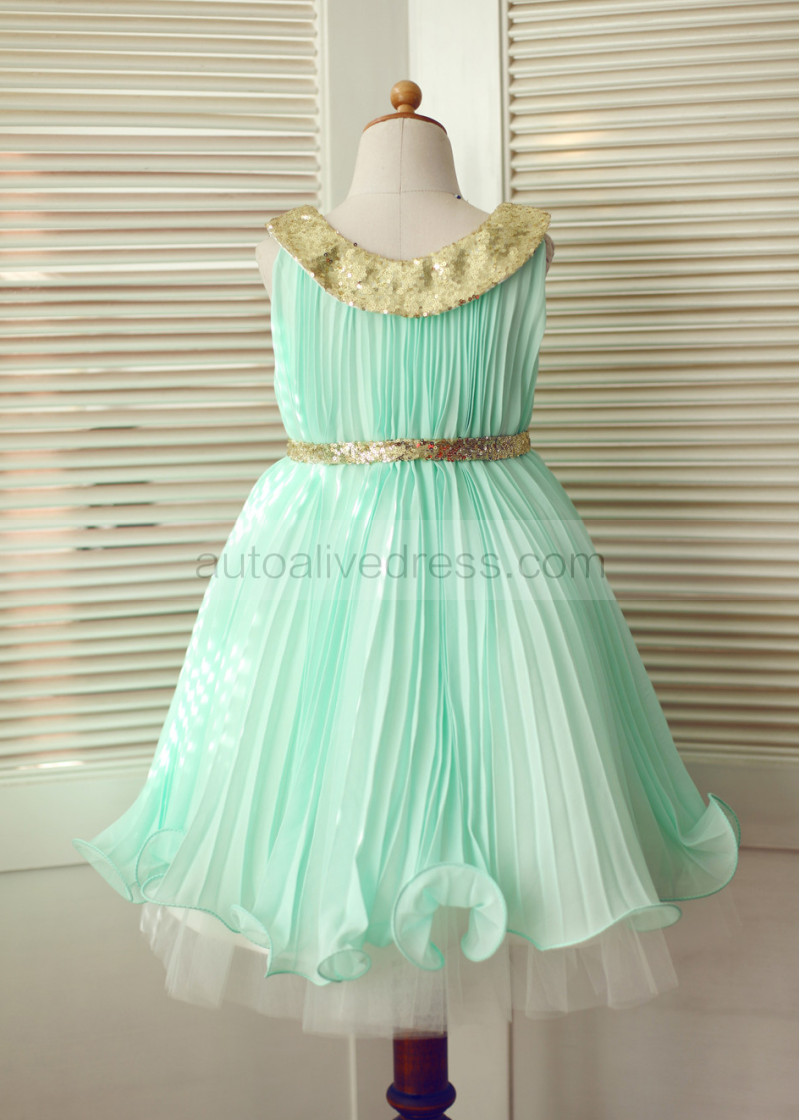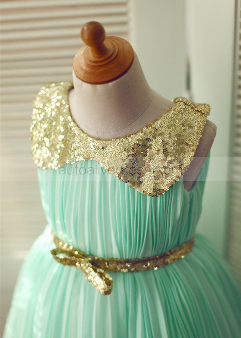 Peter Pan Gold Sequin Collar Mint Green Pleated Chiffon Flower Girl Dress