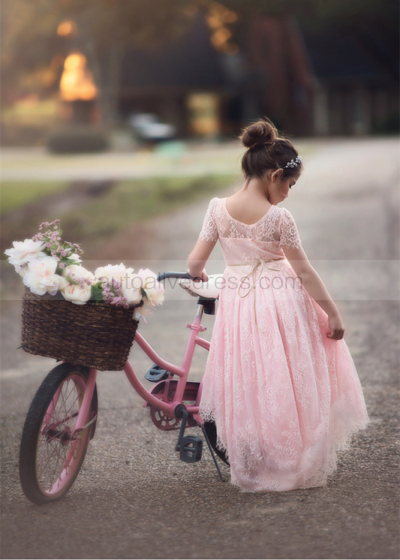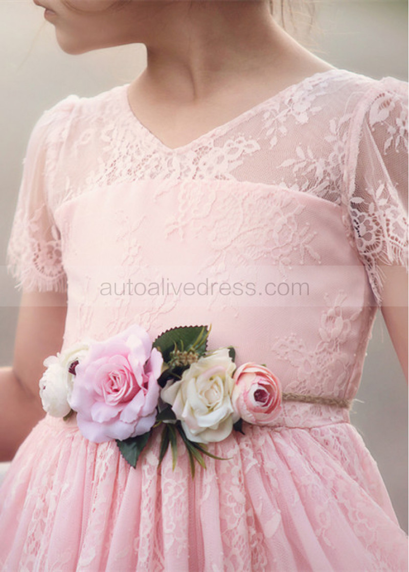 Pink Lace High Low Flower Girl Dress With Floral Sash