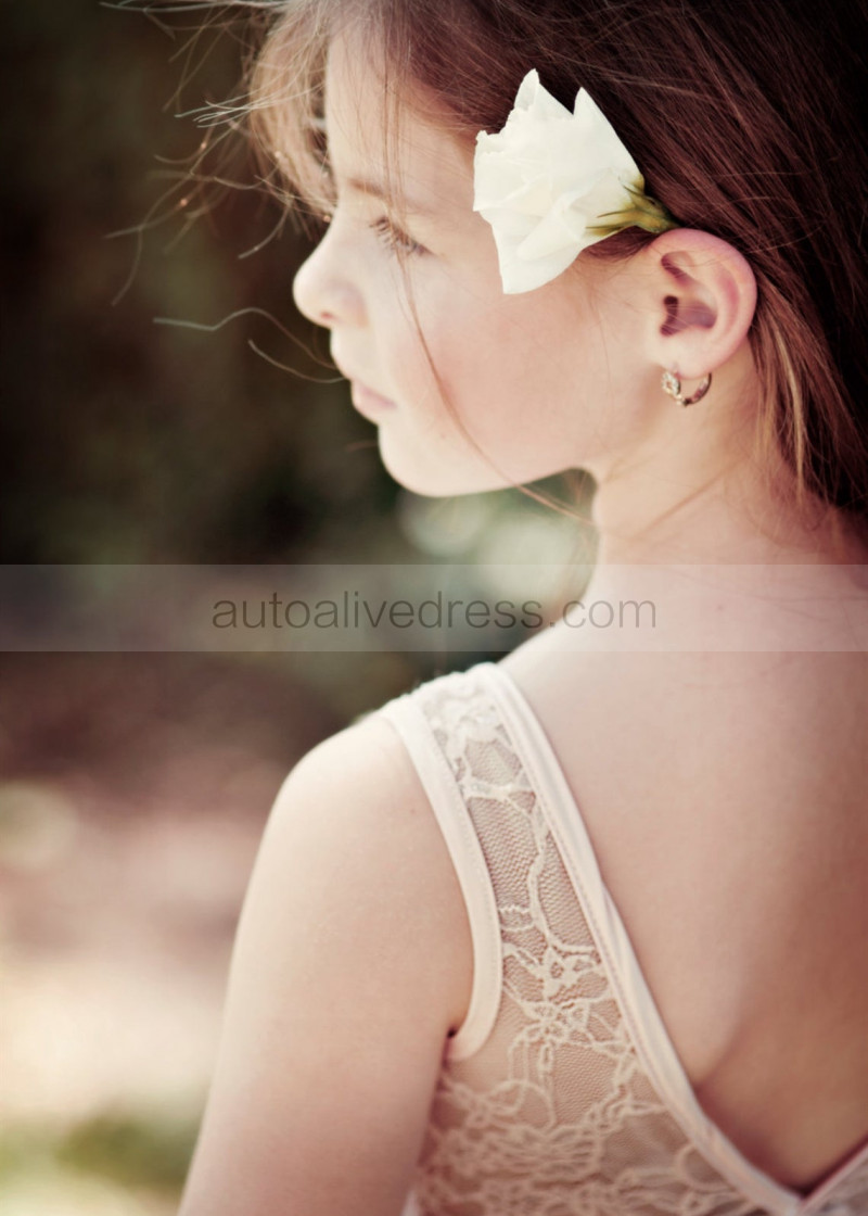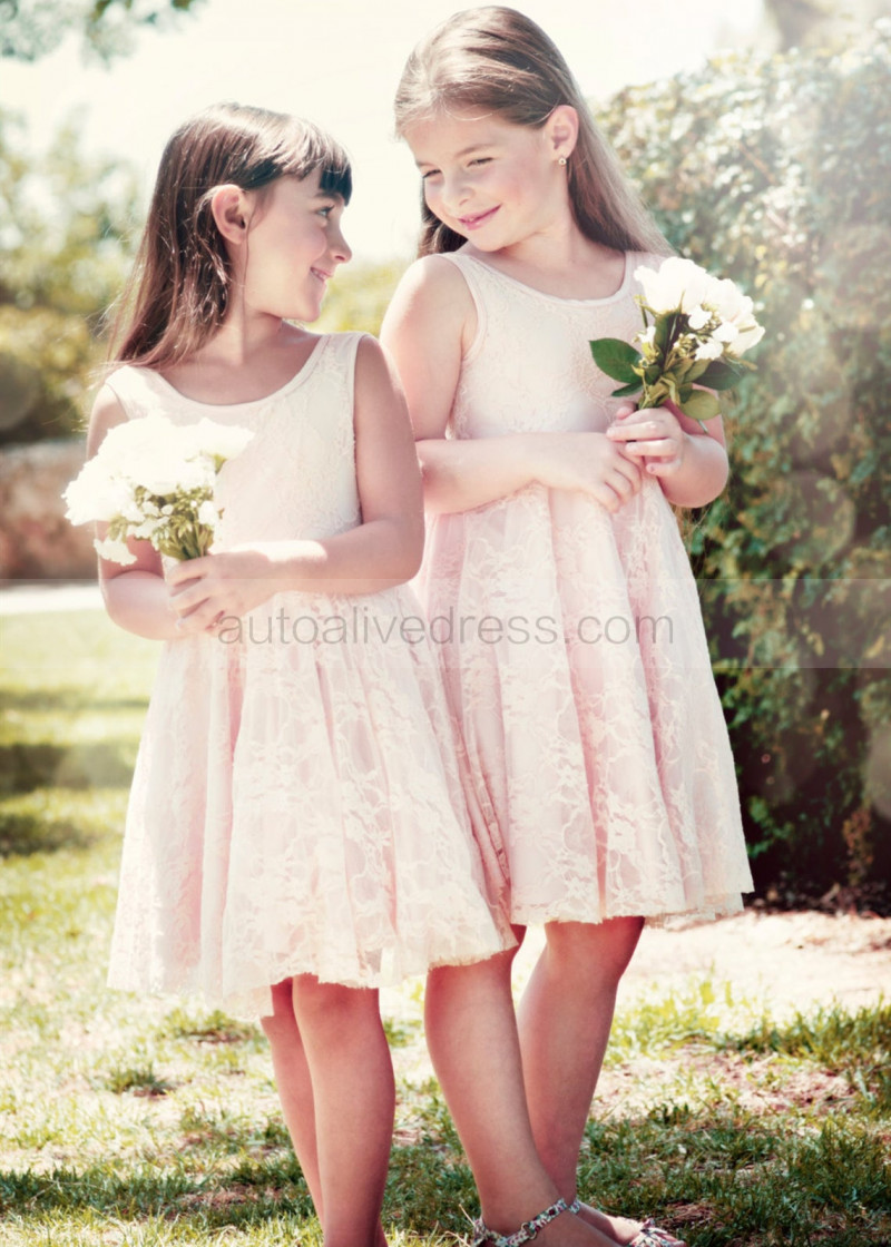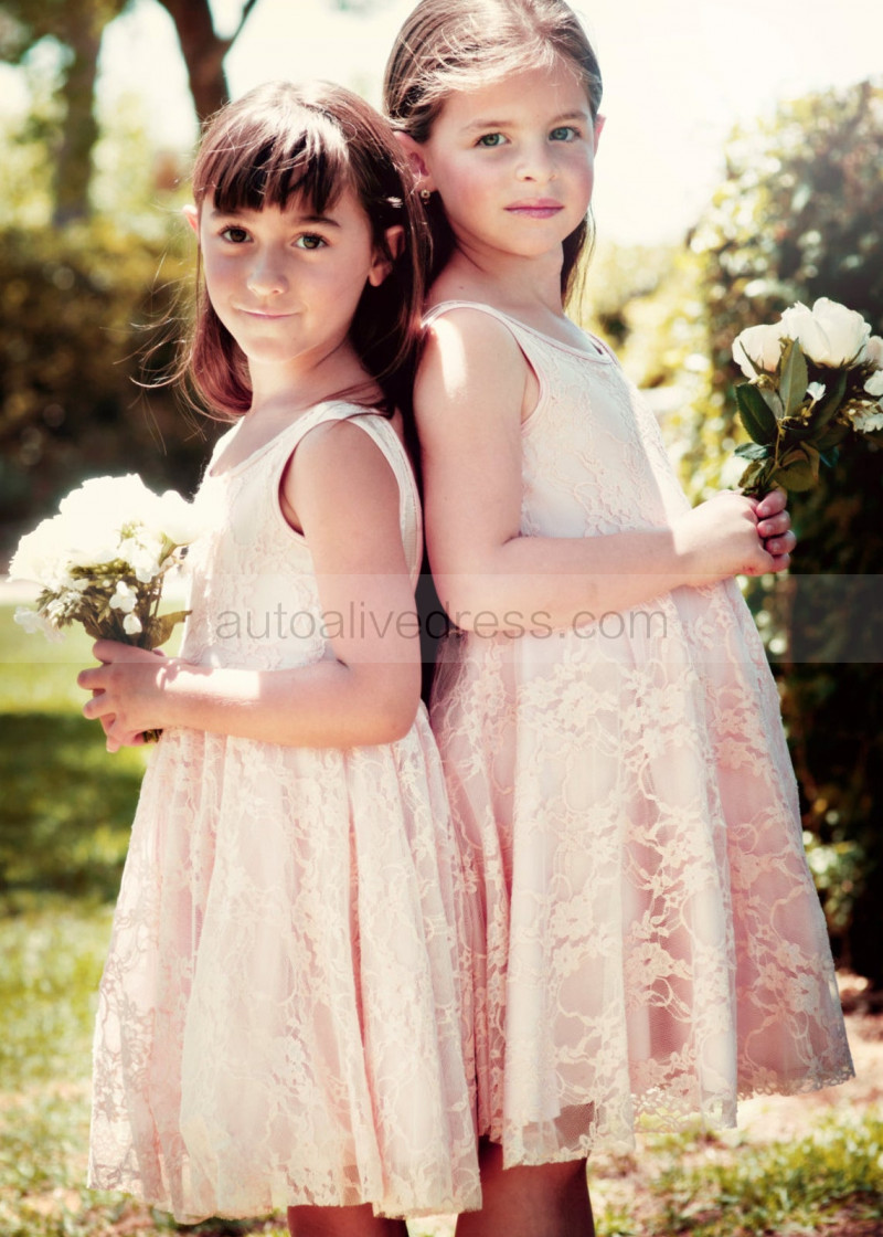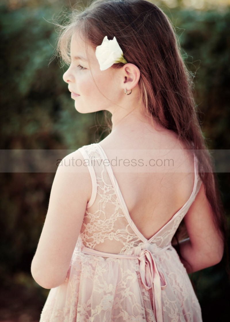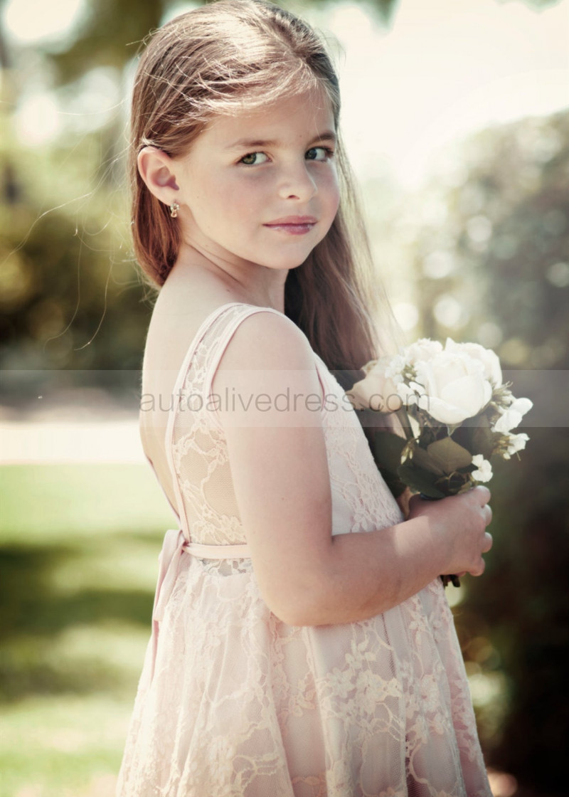 Pink Lace Knee Length V Back Flower Girl Dress