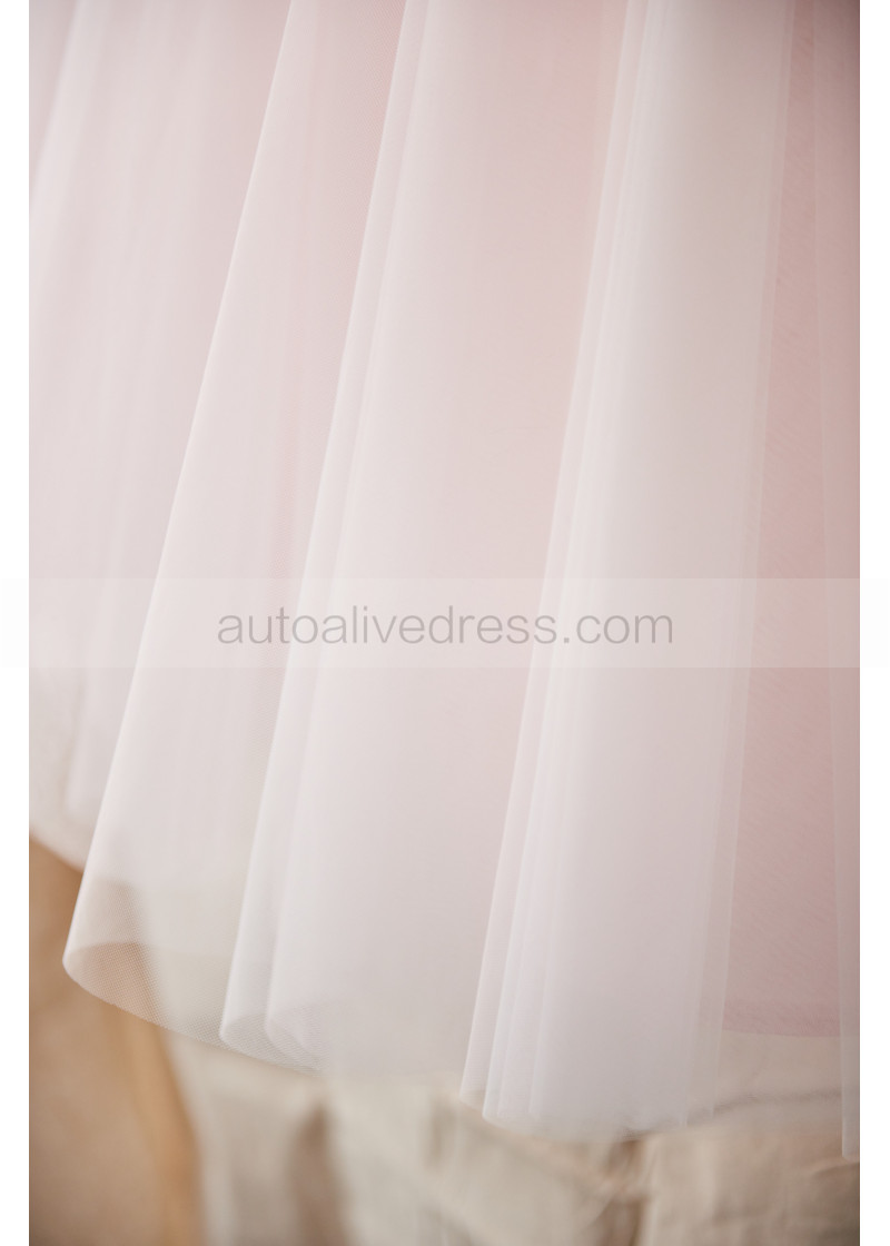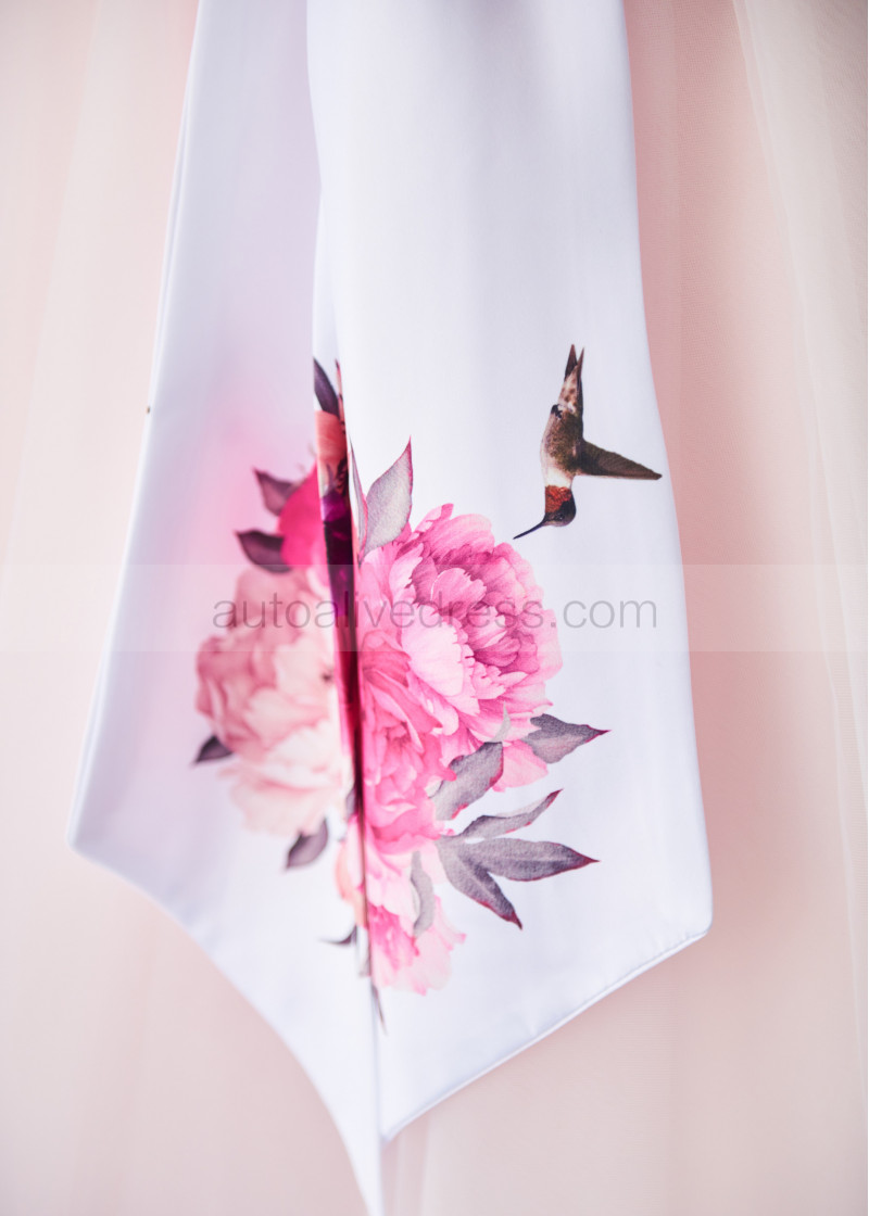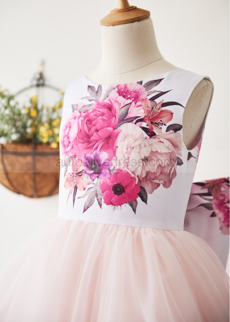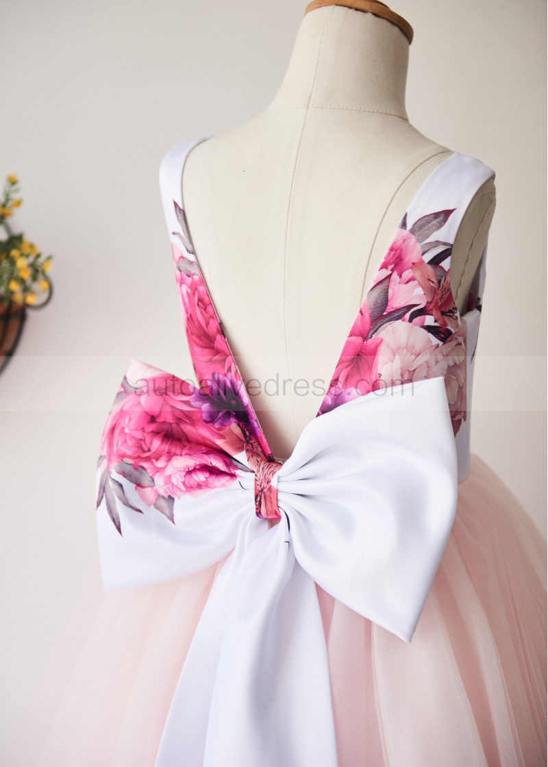 Printed Satin Pink Tulle V Back Floor Length Flower Girl Dress