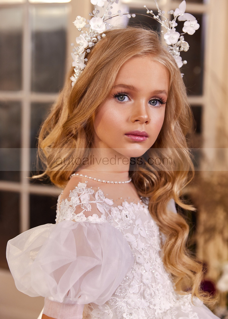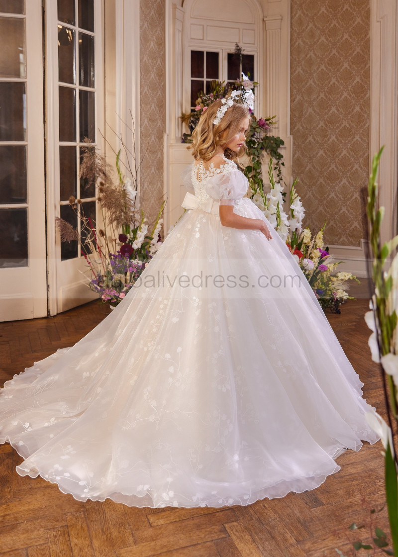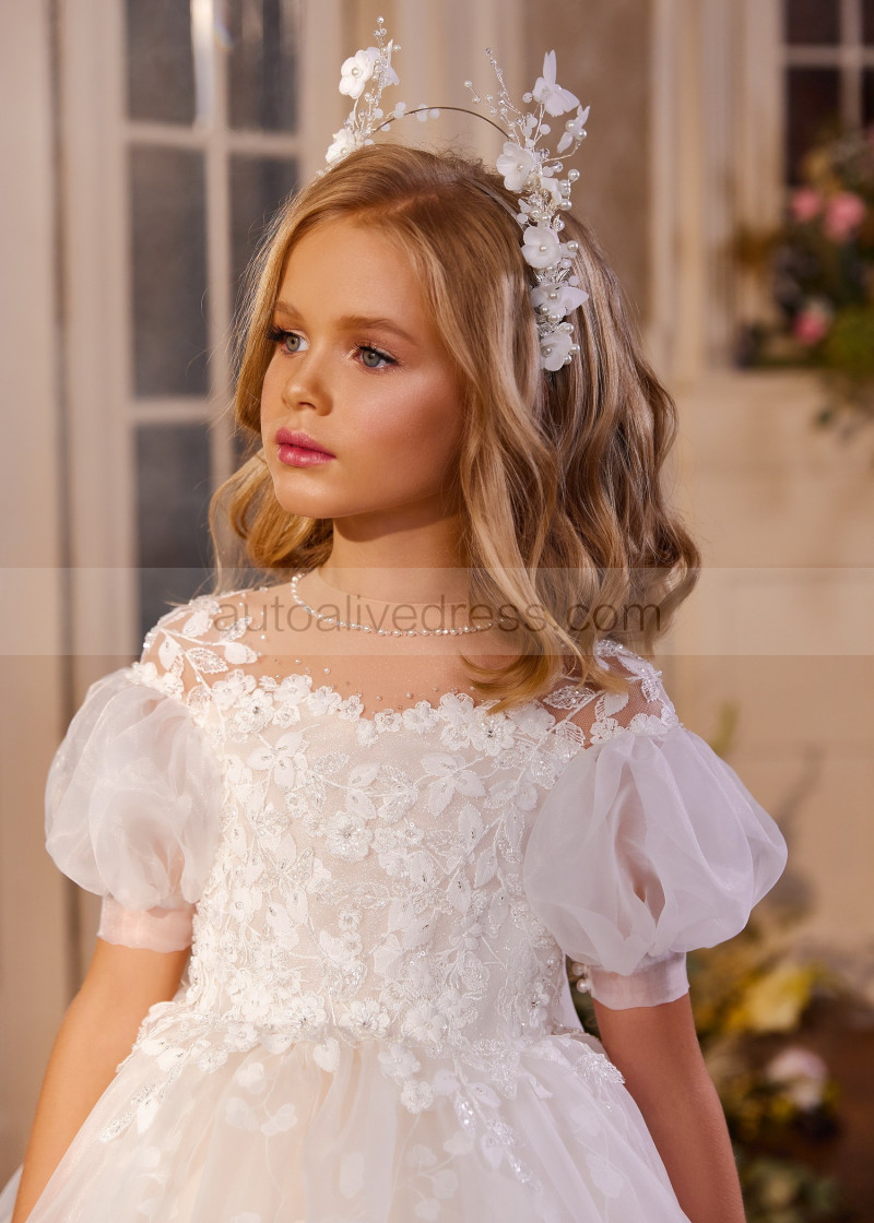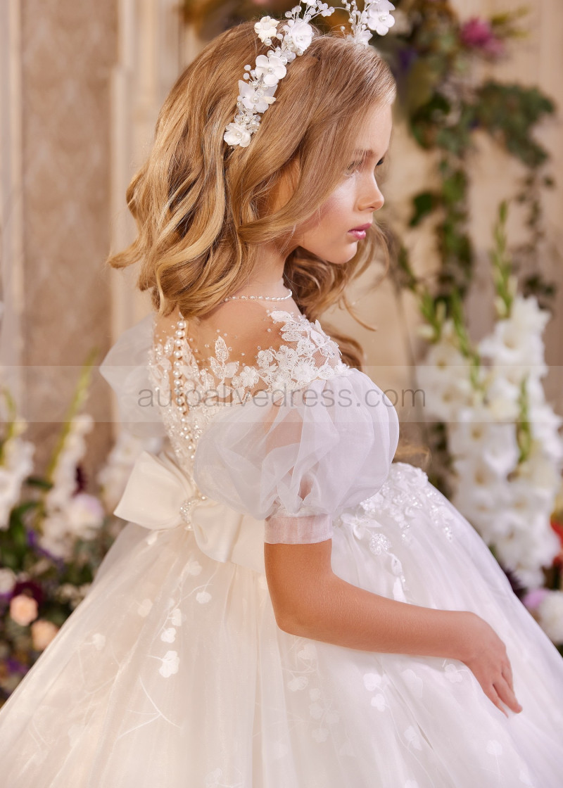 Puff Sleeves Beaded Ivory Organza Lace Romantic Flower Girl Dress
