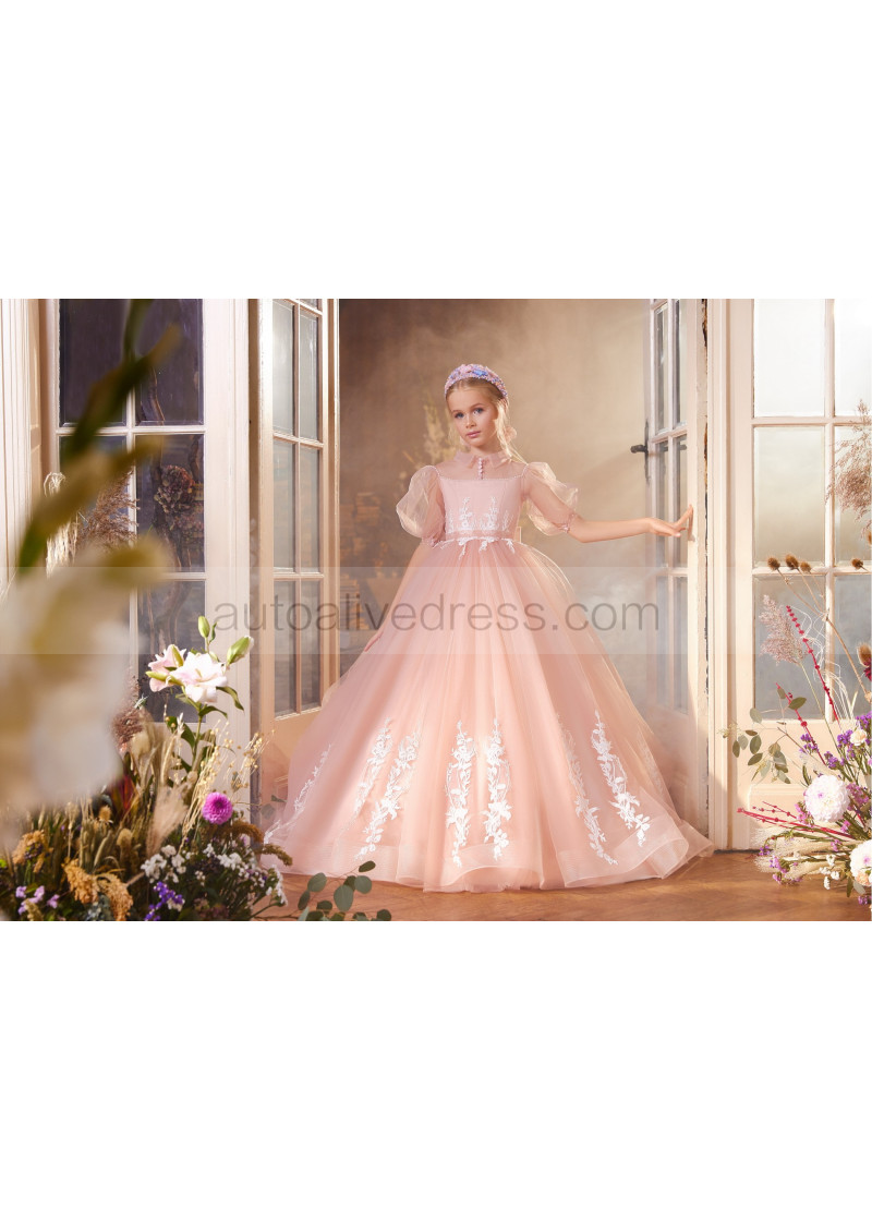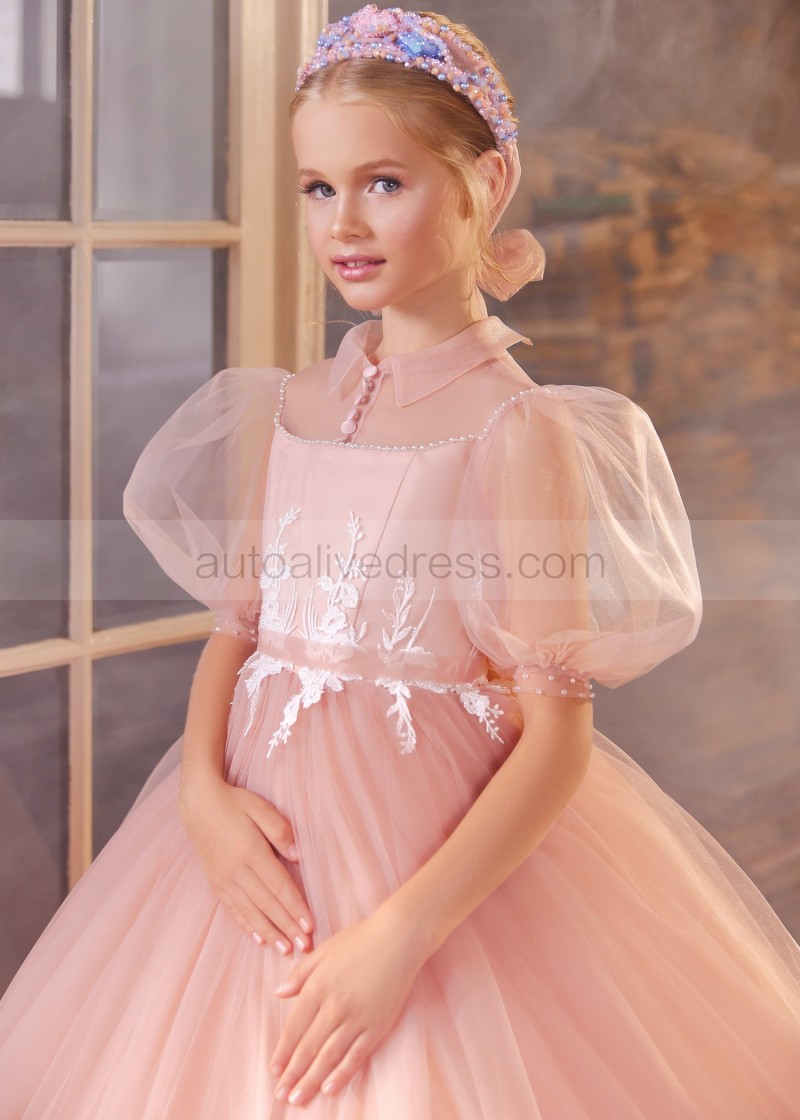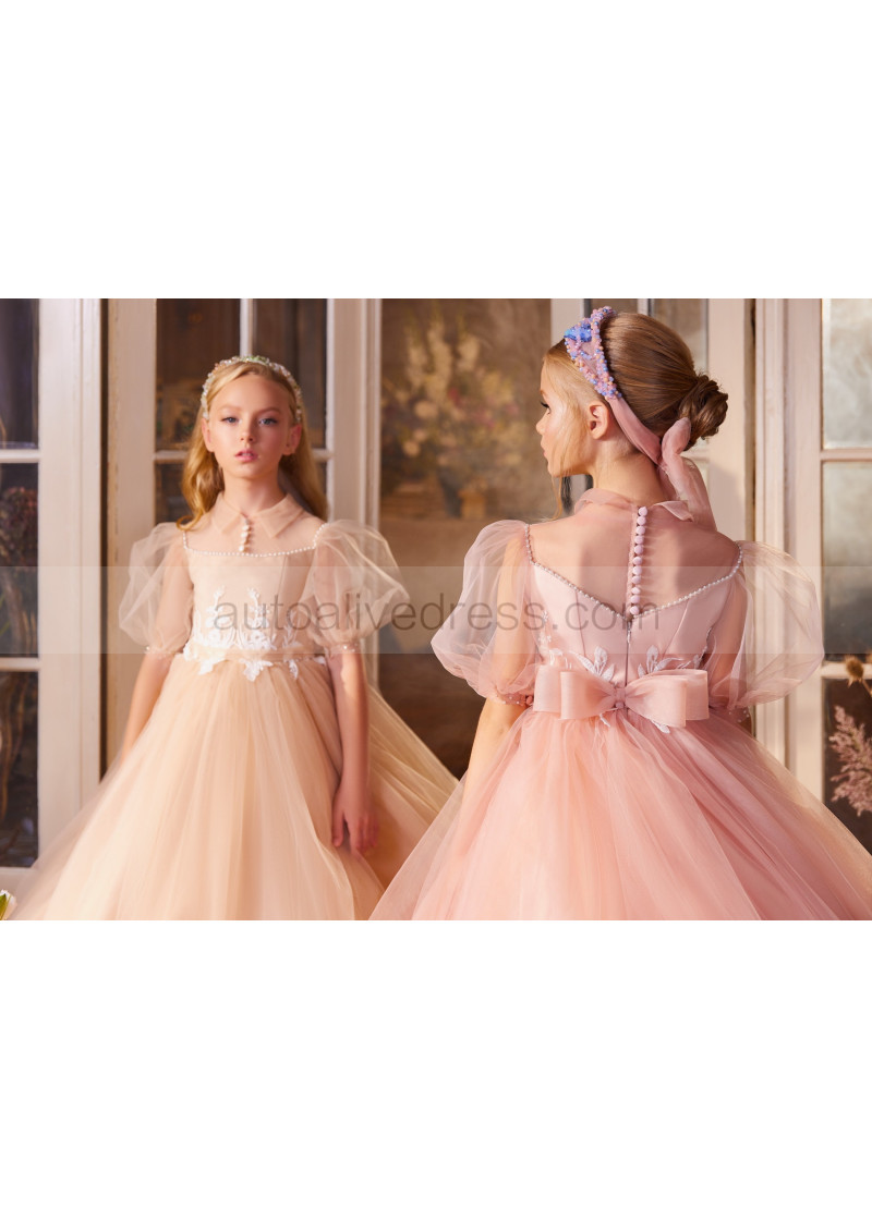 Puff Sleeves Beaded Lace Tulle Flower Girl Dress With Horsehair Hem