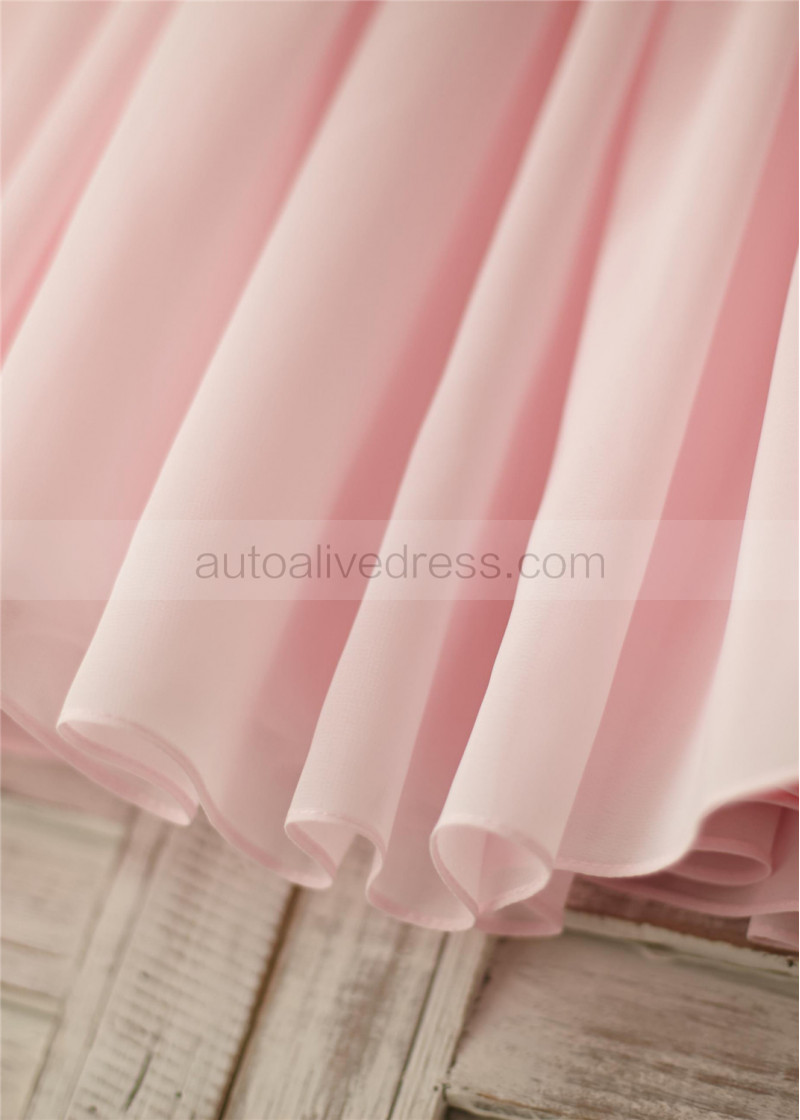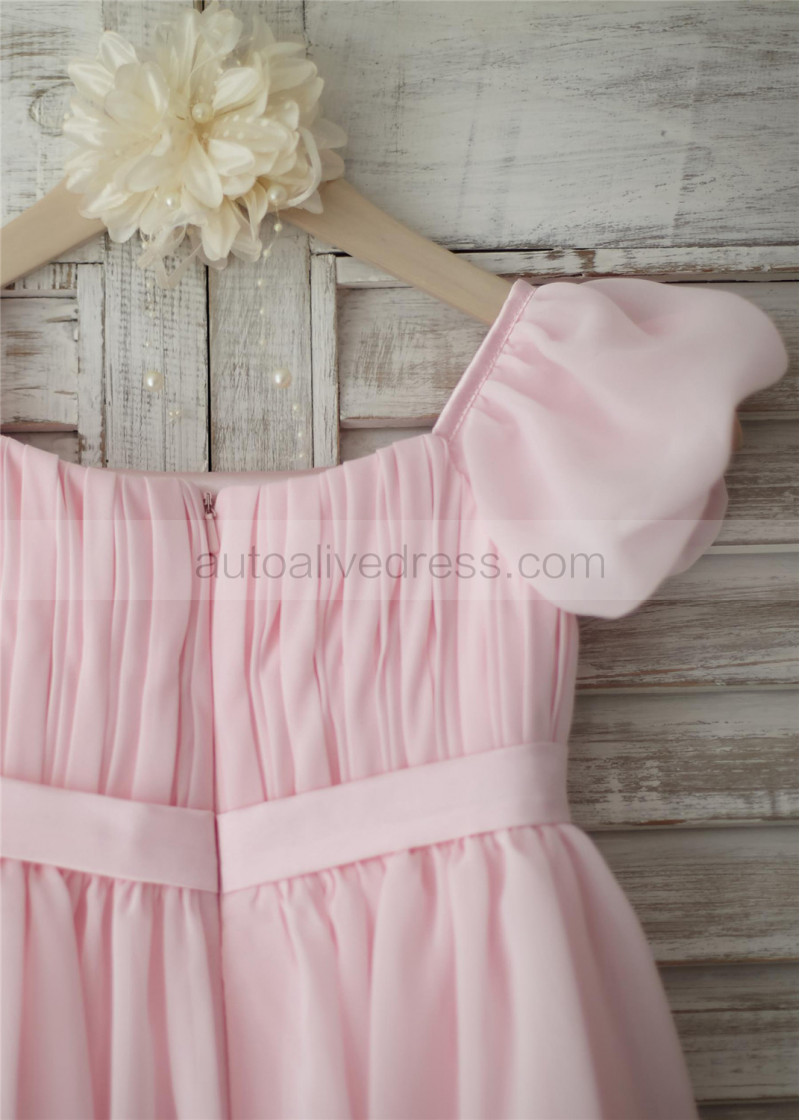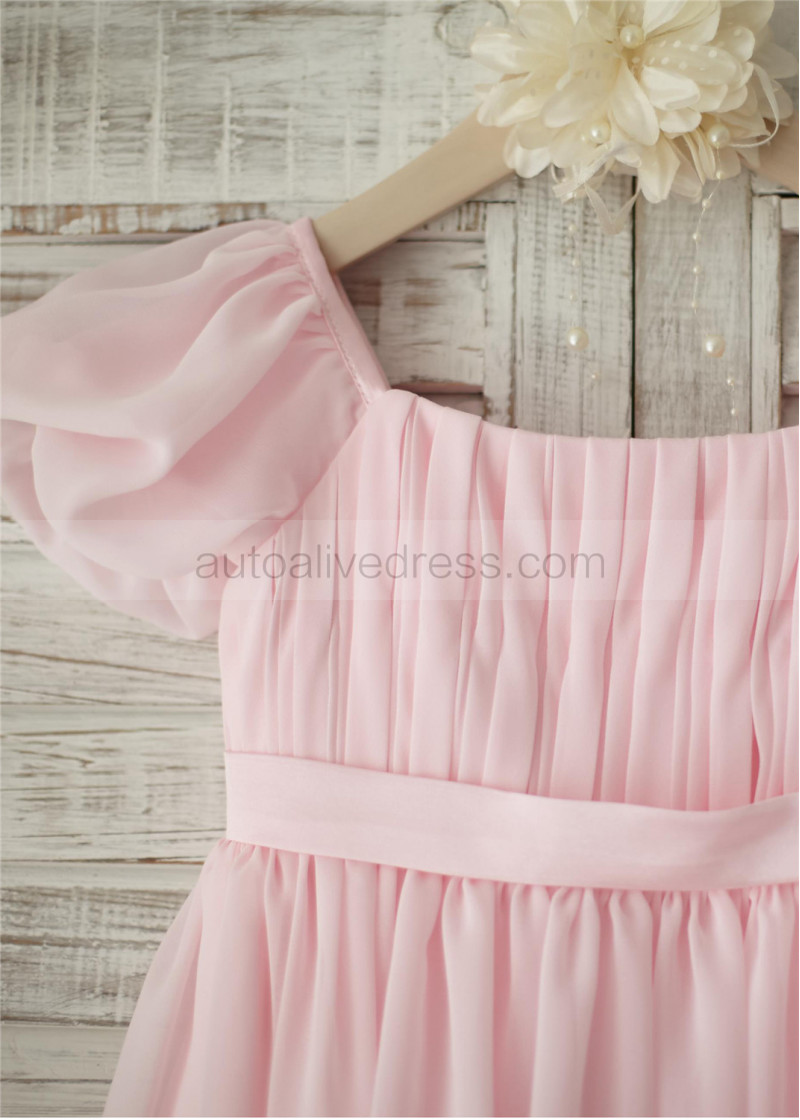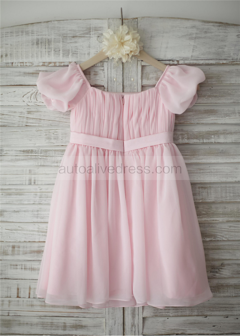 Puff Sleeves Pink Chiffon Knee Length Flower Girl Dress
