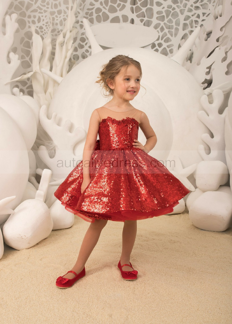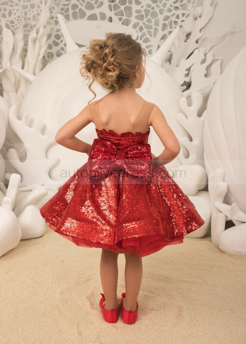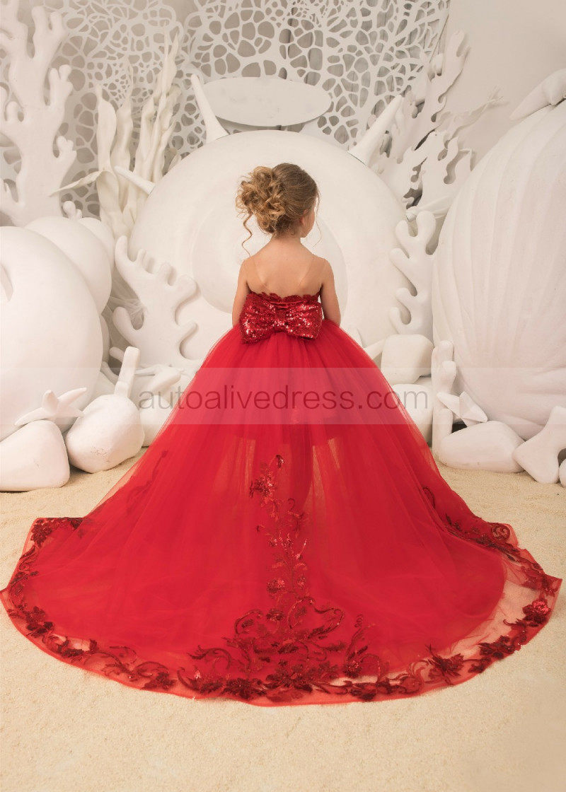 Red Sequin Tulle Knee Length Flower Girl Dress With Removable Train