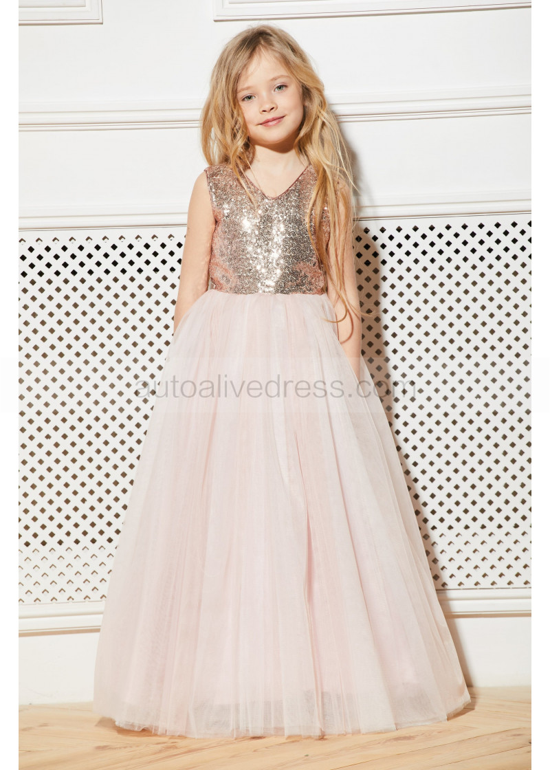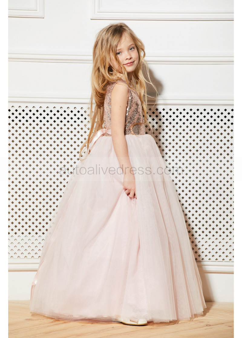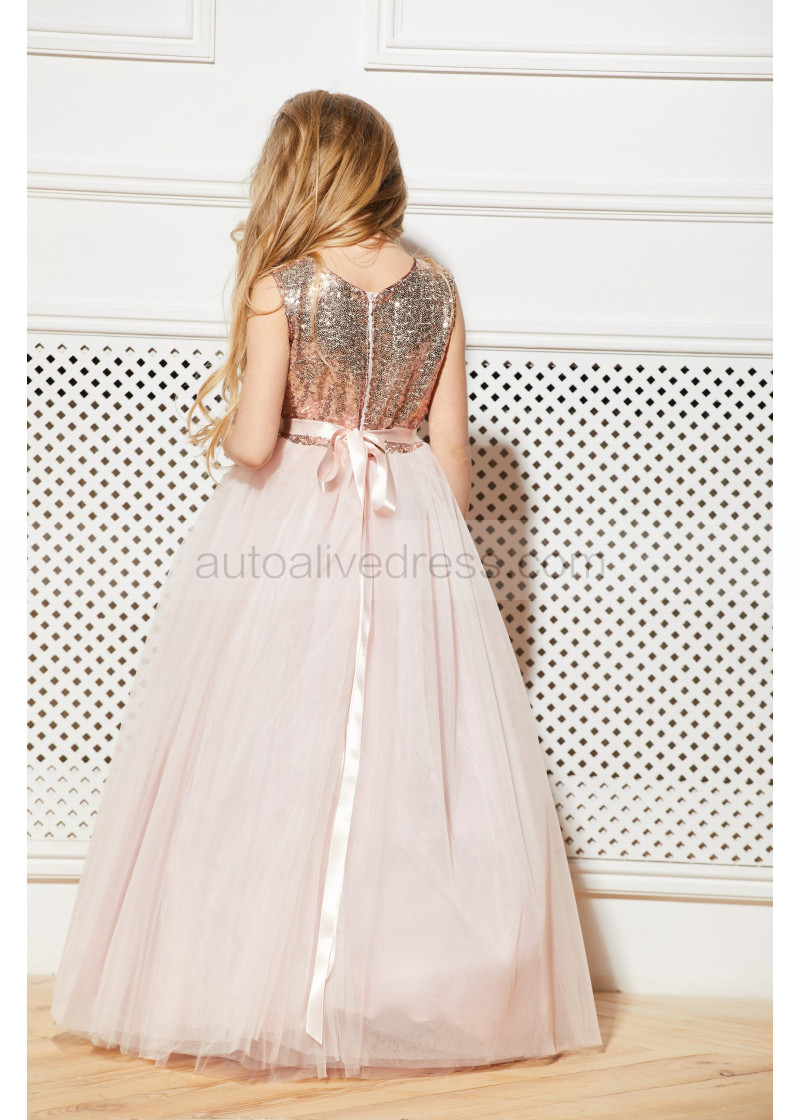Rose Gold Sequin Blush Pink Tulle Classic Long Flower Girl Dress