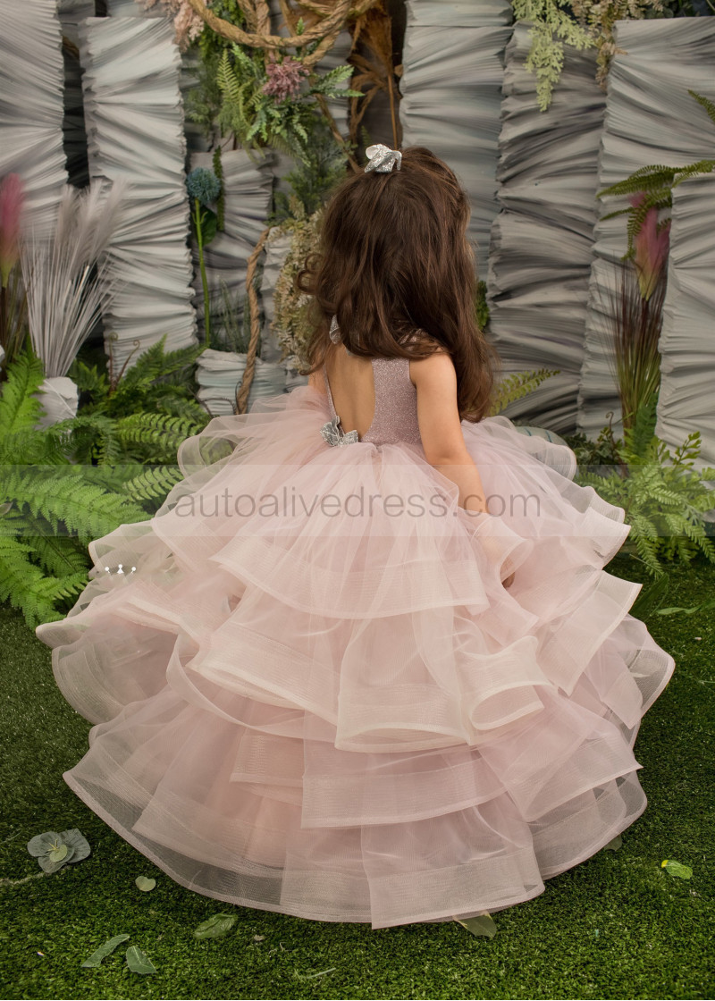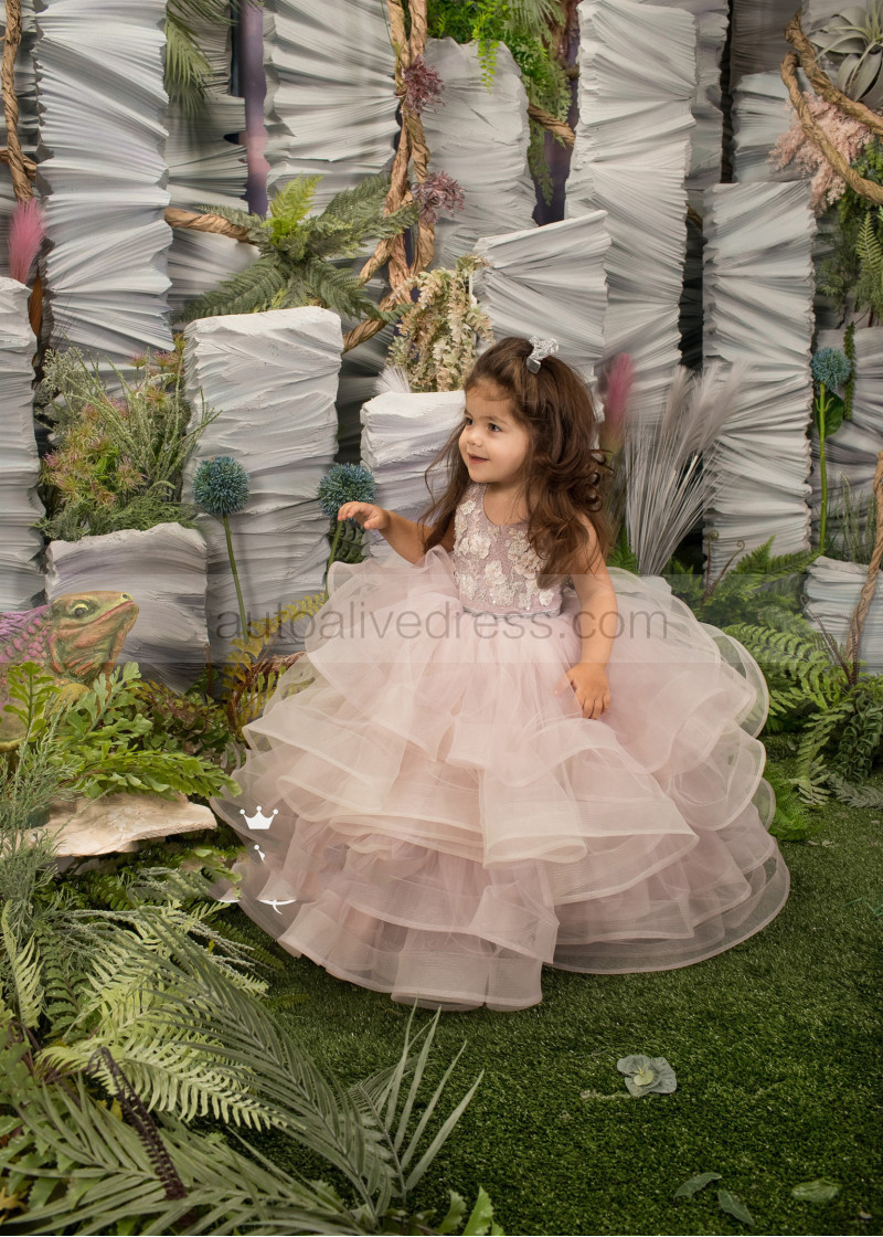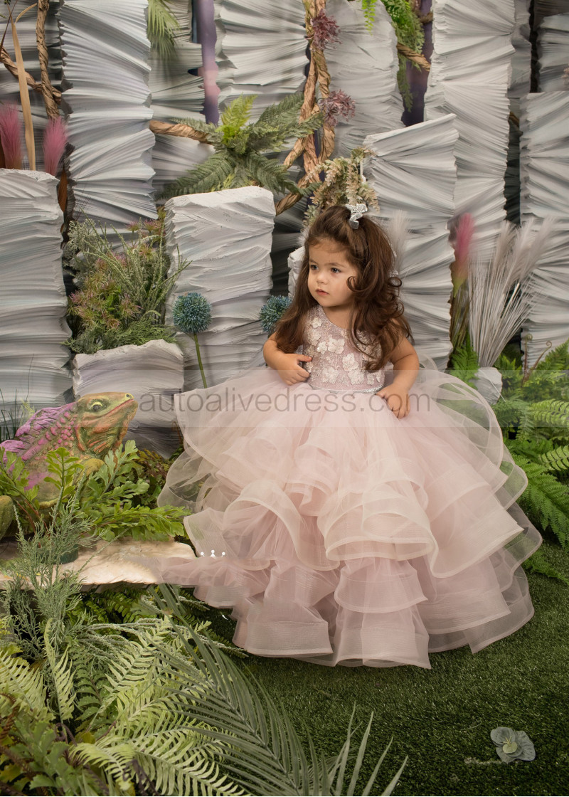 Rose Pink Lace Tulle Ruffle Keyhole Back Flower Girl Dress