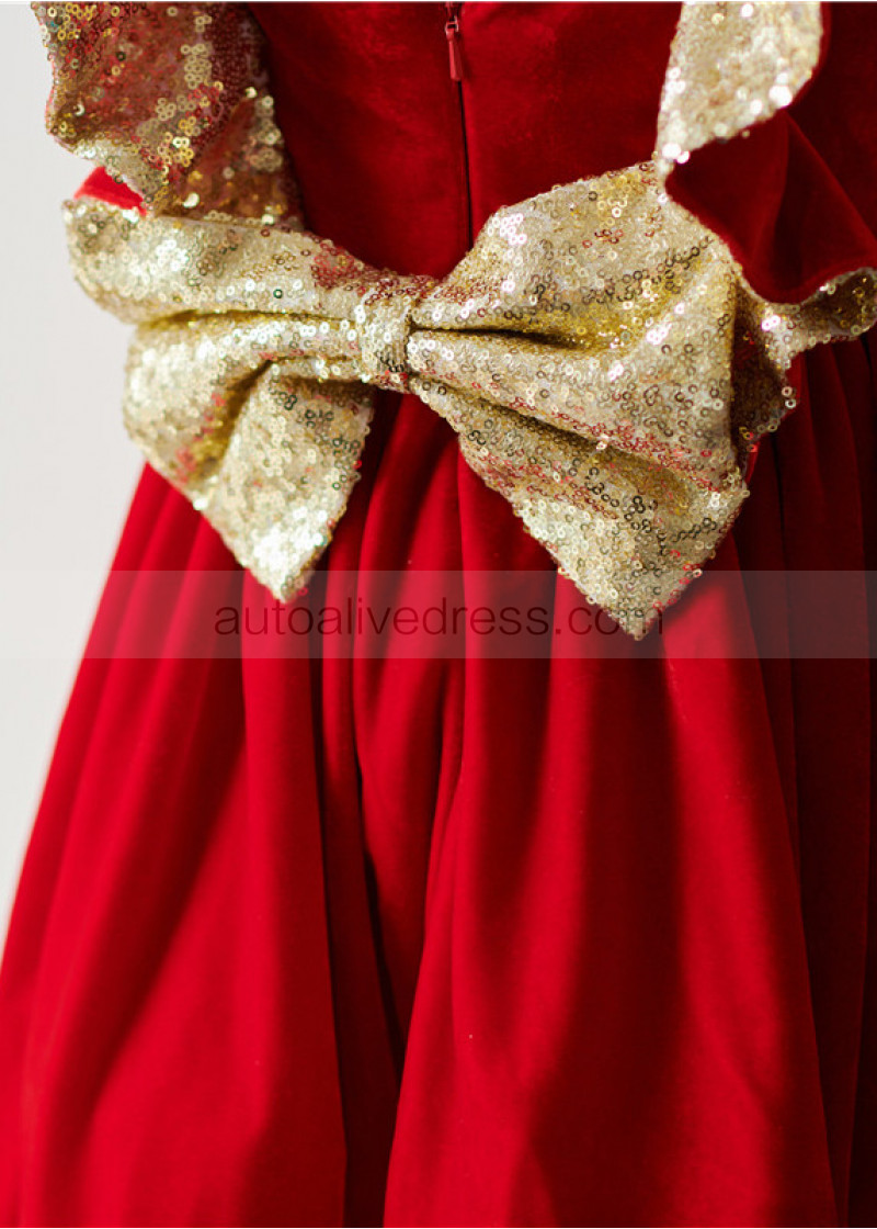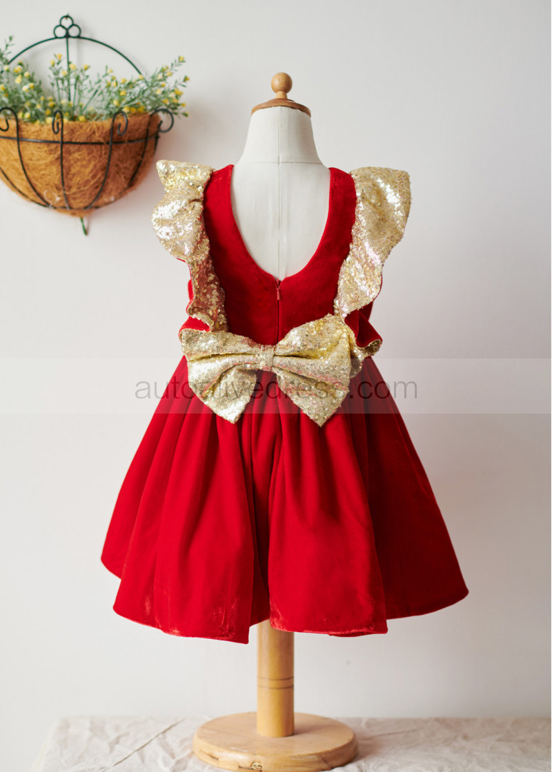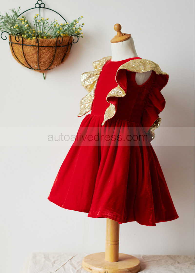 Ruffle Flutter Sleeves Red Velvet Gold Sequin V Back Flower Girl Dress