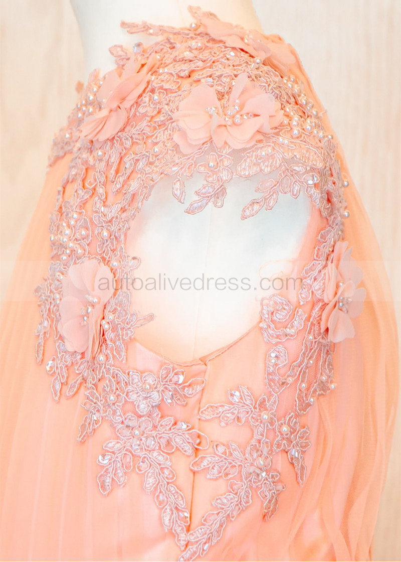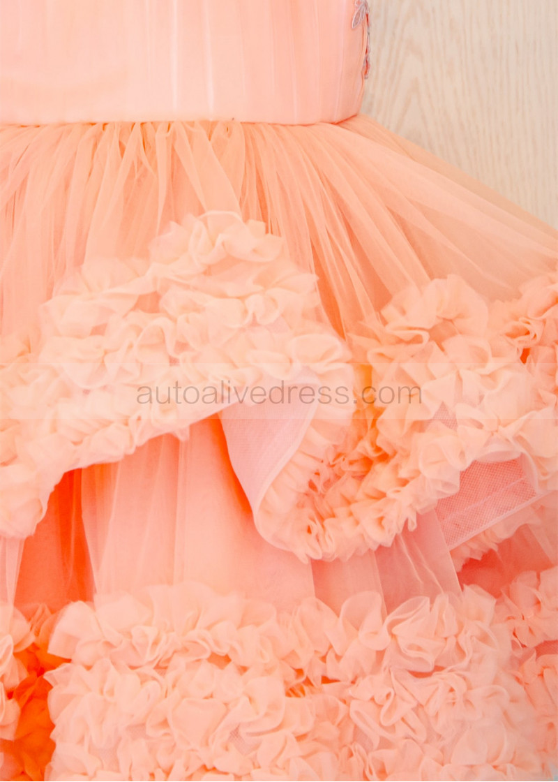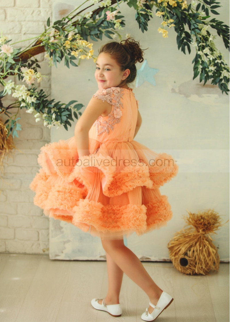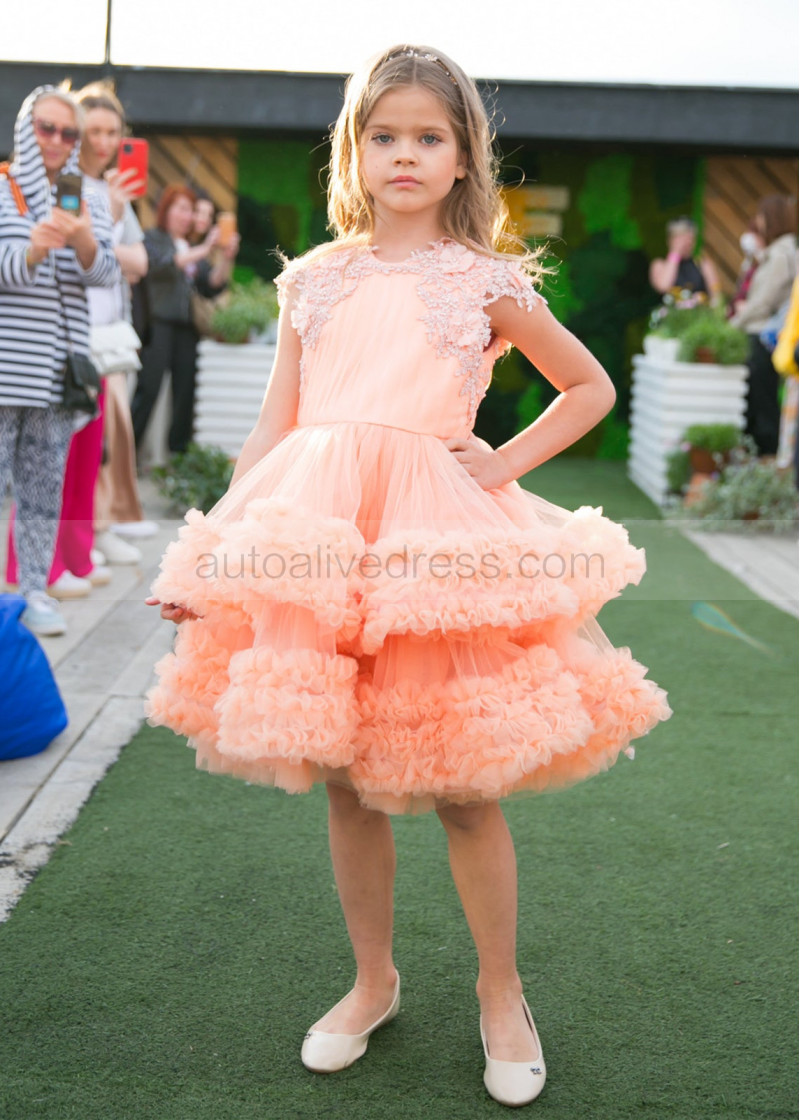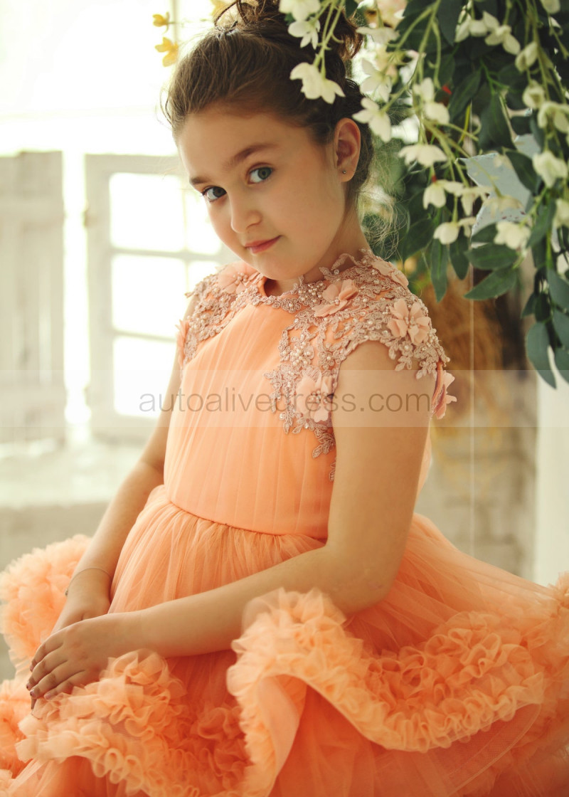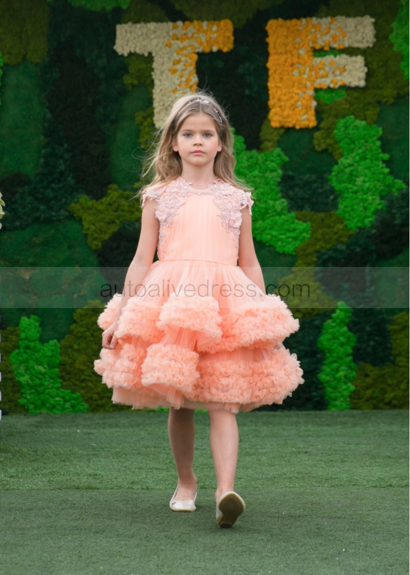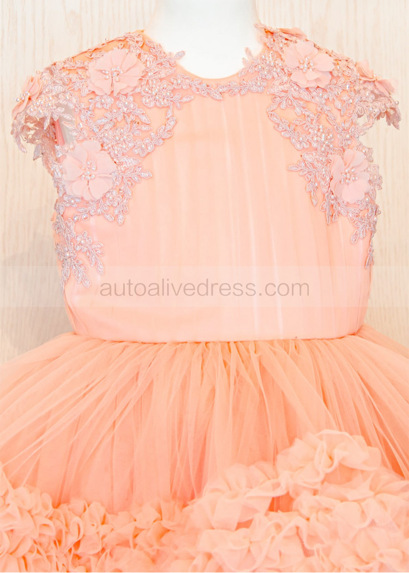Salmon Ruffle Tulle Lace Appliques Flower Girl Dress