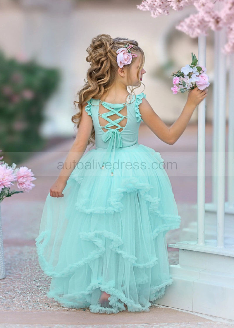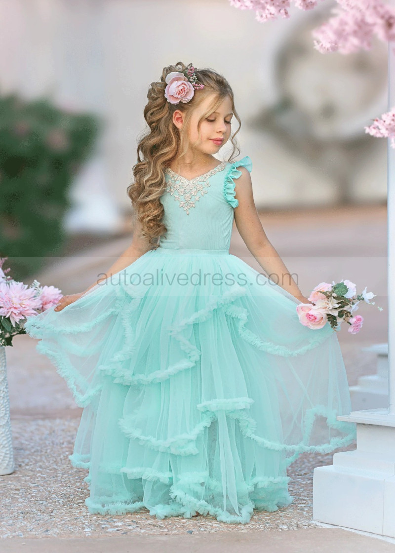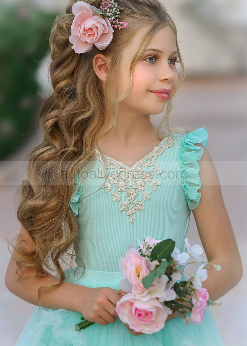 Seafoam Blue Tulle Gold Lace Corset Back Flower Girl Dress