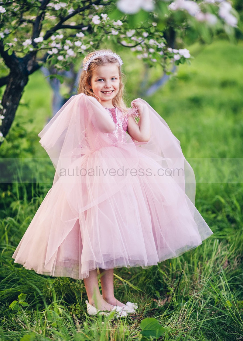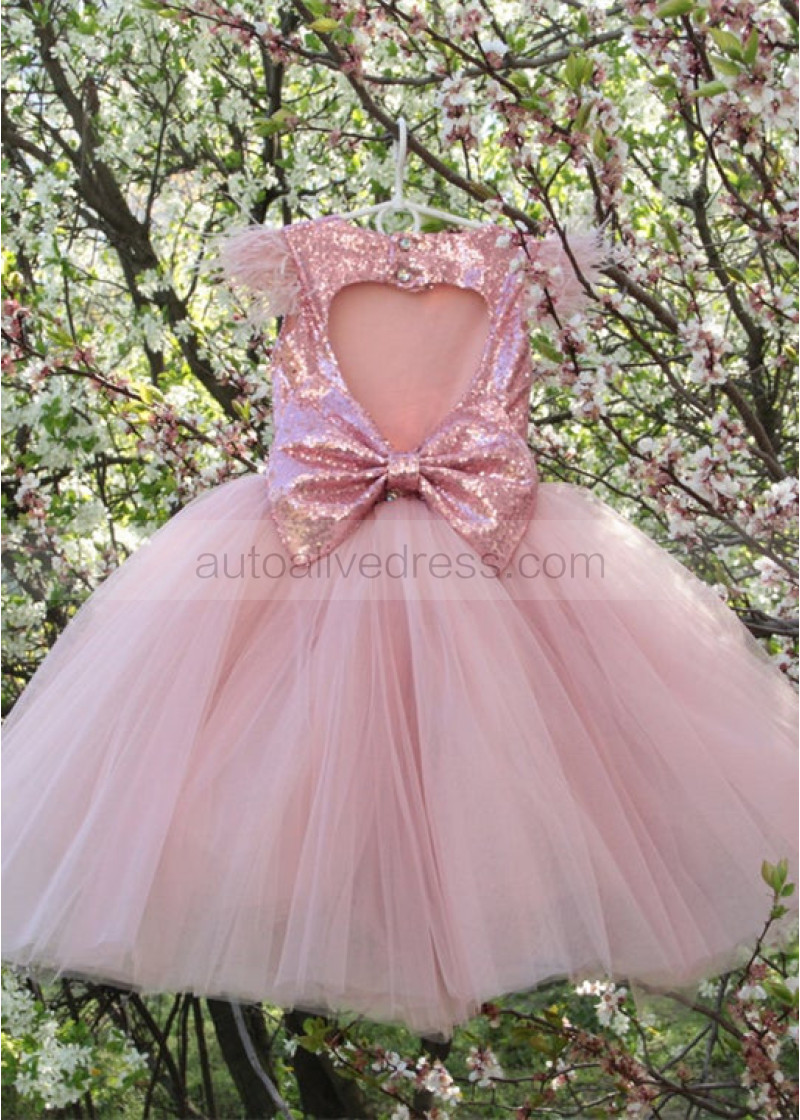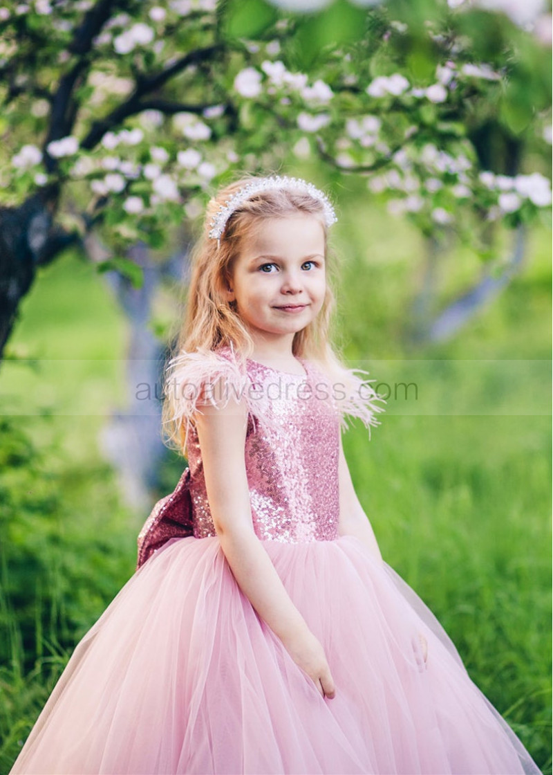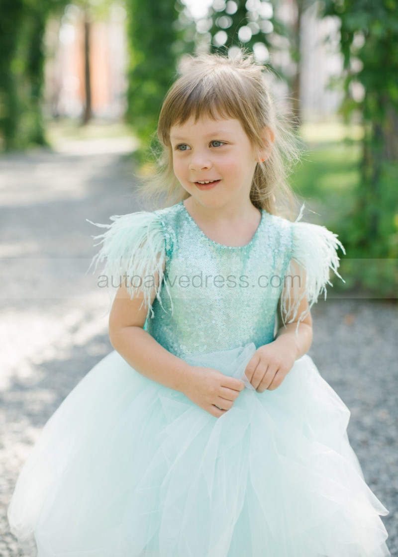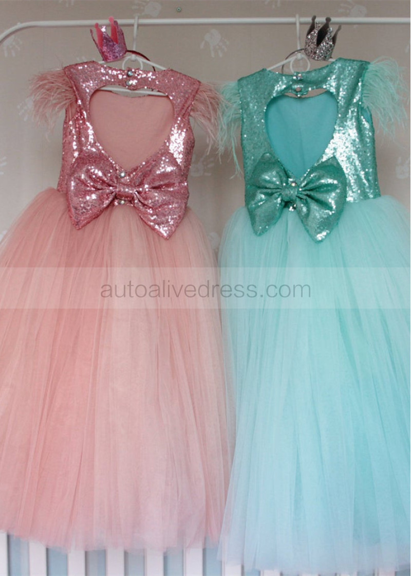 Sequin Tulle Feather Keyhole Back Flower Girl Dress