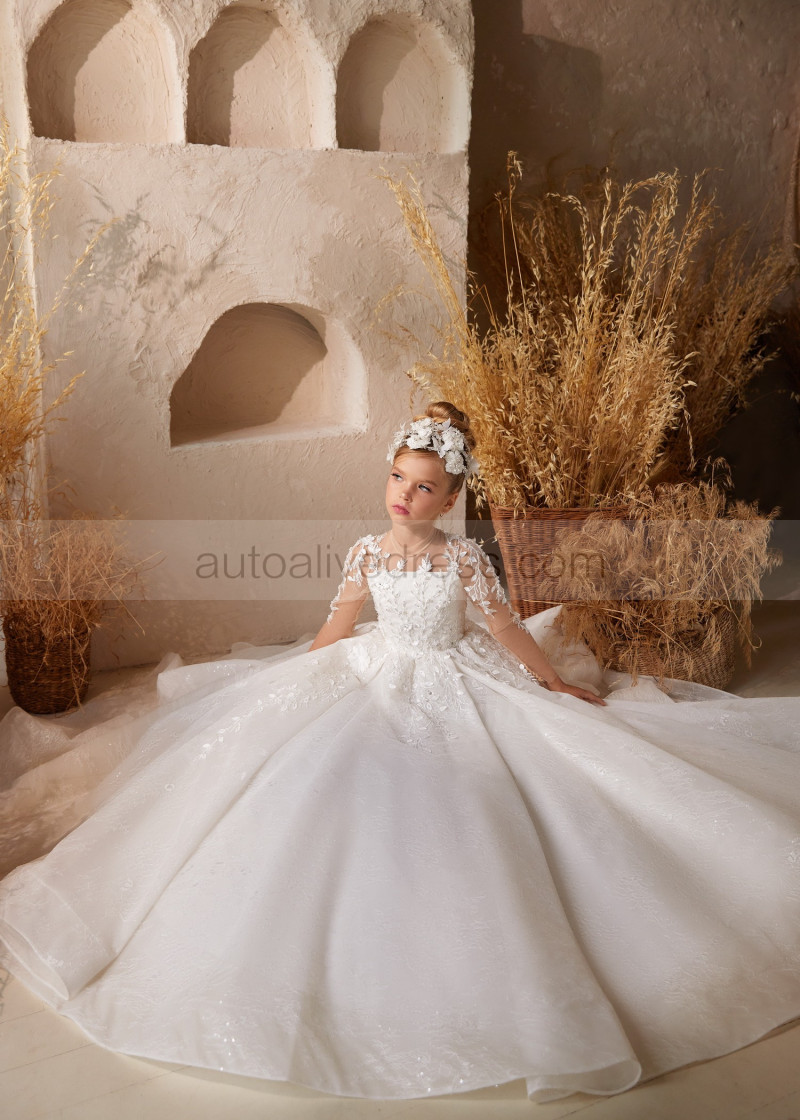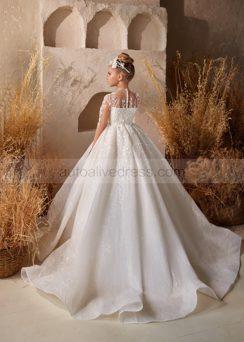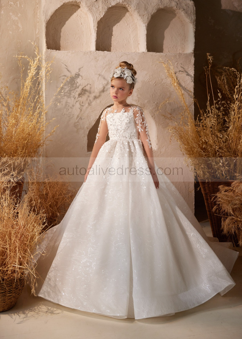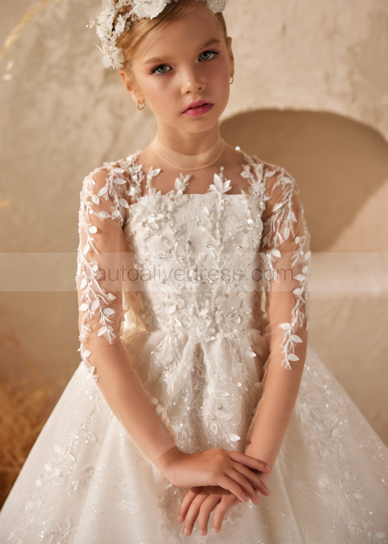 Sheer Long Sleeves Beaded Ivory Lace Tulle Sparkly Flower Girl Dress