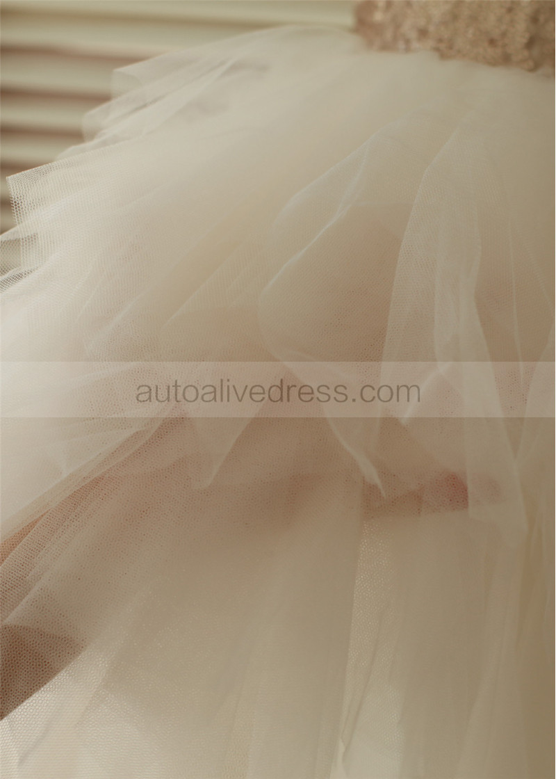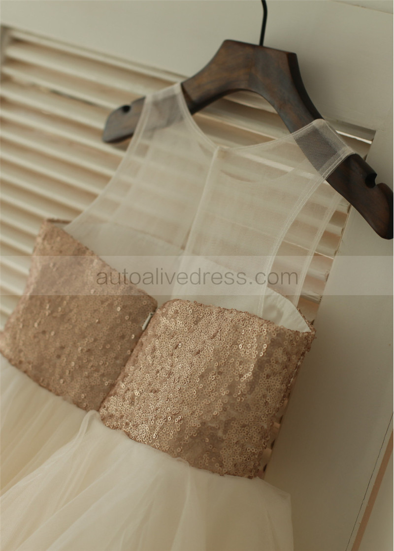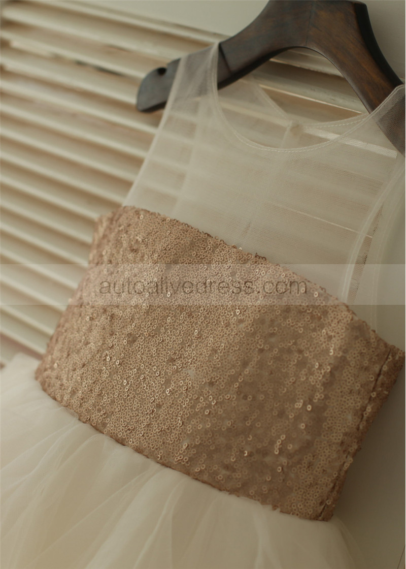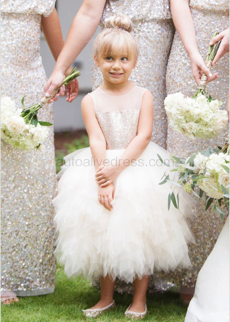 Sheer Neck Champagne Sequin Tulle Ruffled Timeless Flower Girl Dress