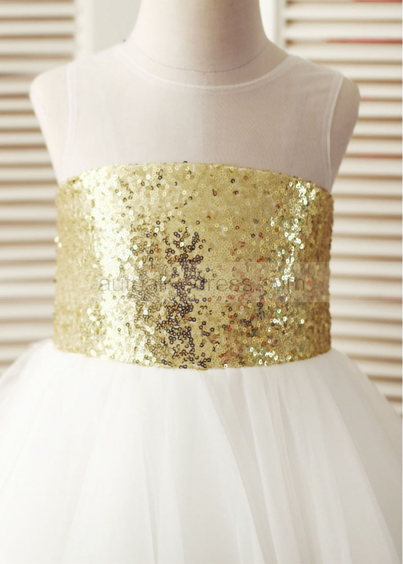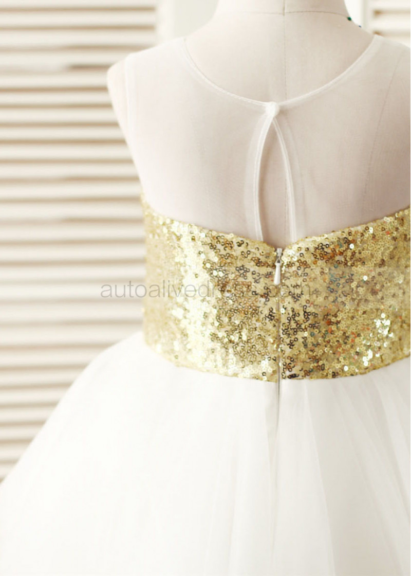 Sheer Neck Gold Sequin Ivory Tulle Ruffled Slit Back Flower Girl Dress