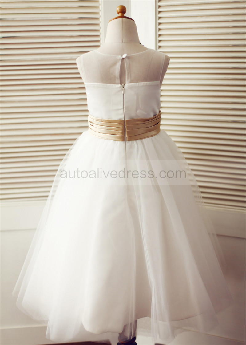 Sheer Neck Ivory Lace Tulle Tea Length Flower Girl Dress