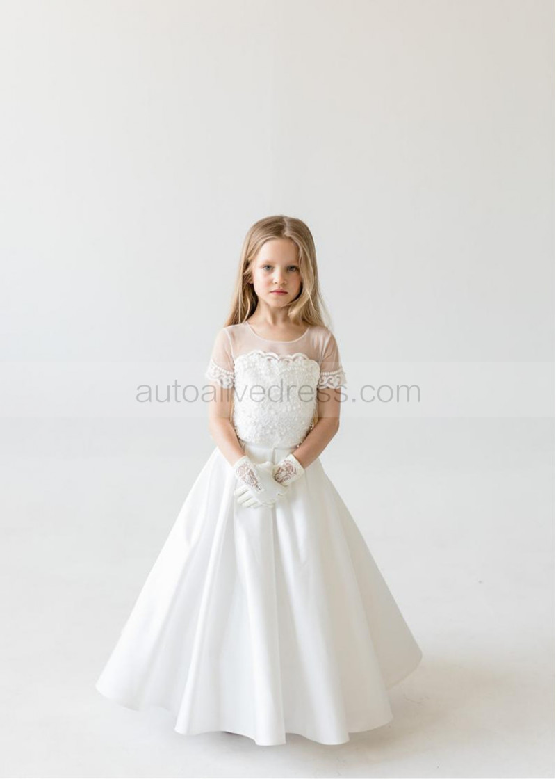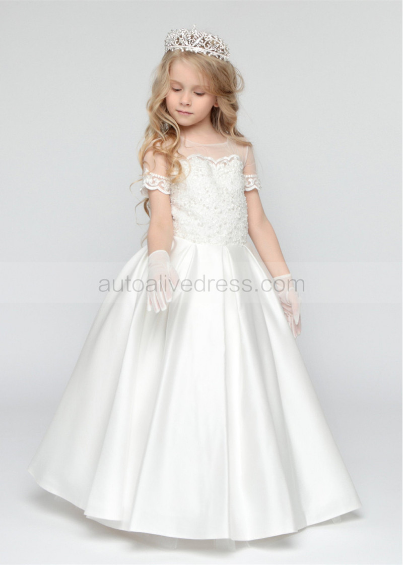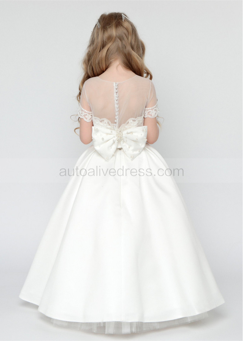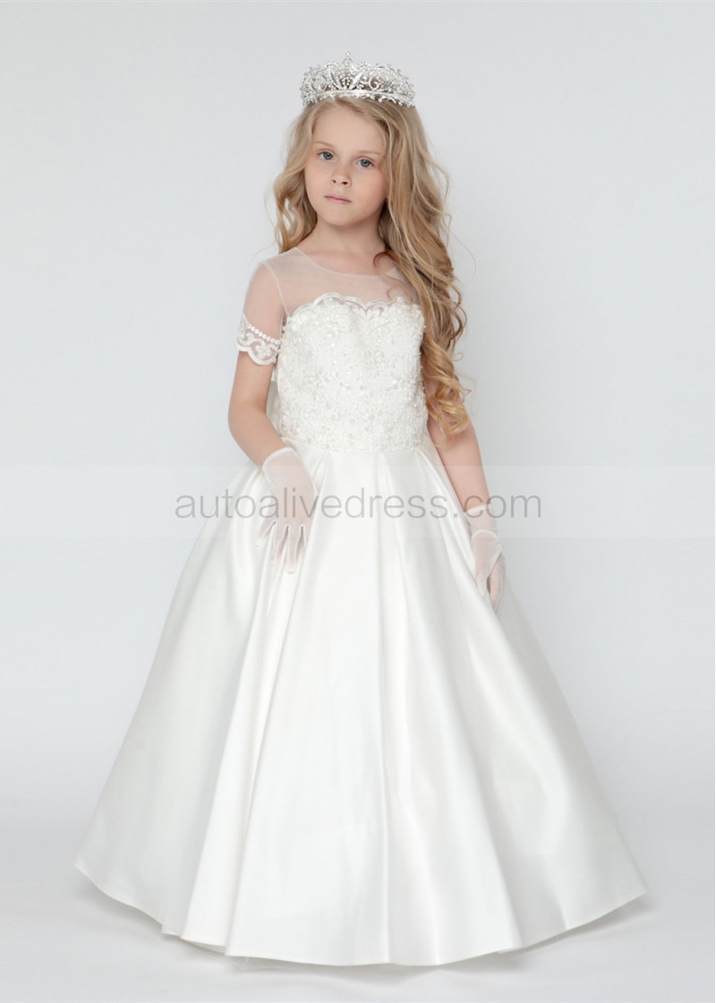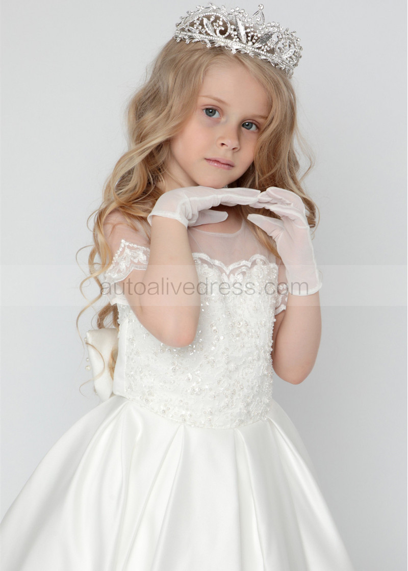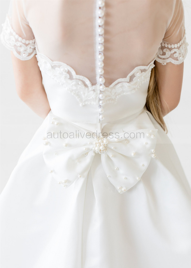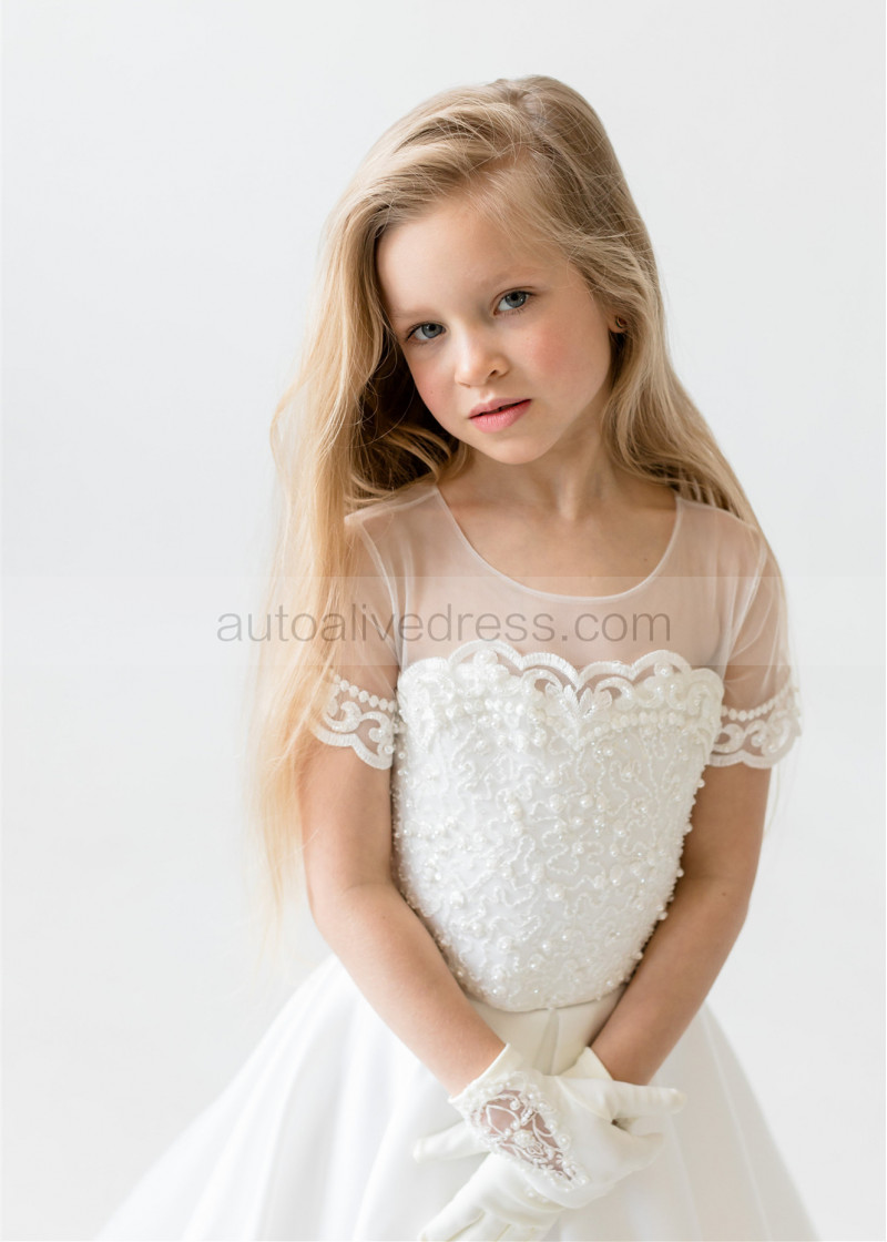 Short Sleeves Beaded Ivory Lace Satin Pearl Long Flower Girl Dress Princess Dress