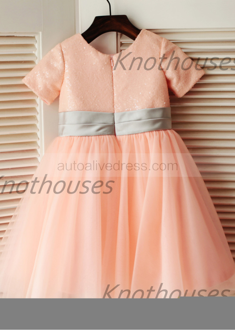 Short Sleeves Blush Pink Sequin Tulle Knee Length Flower Girl Dress