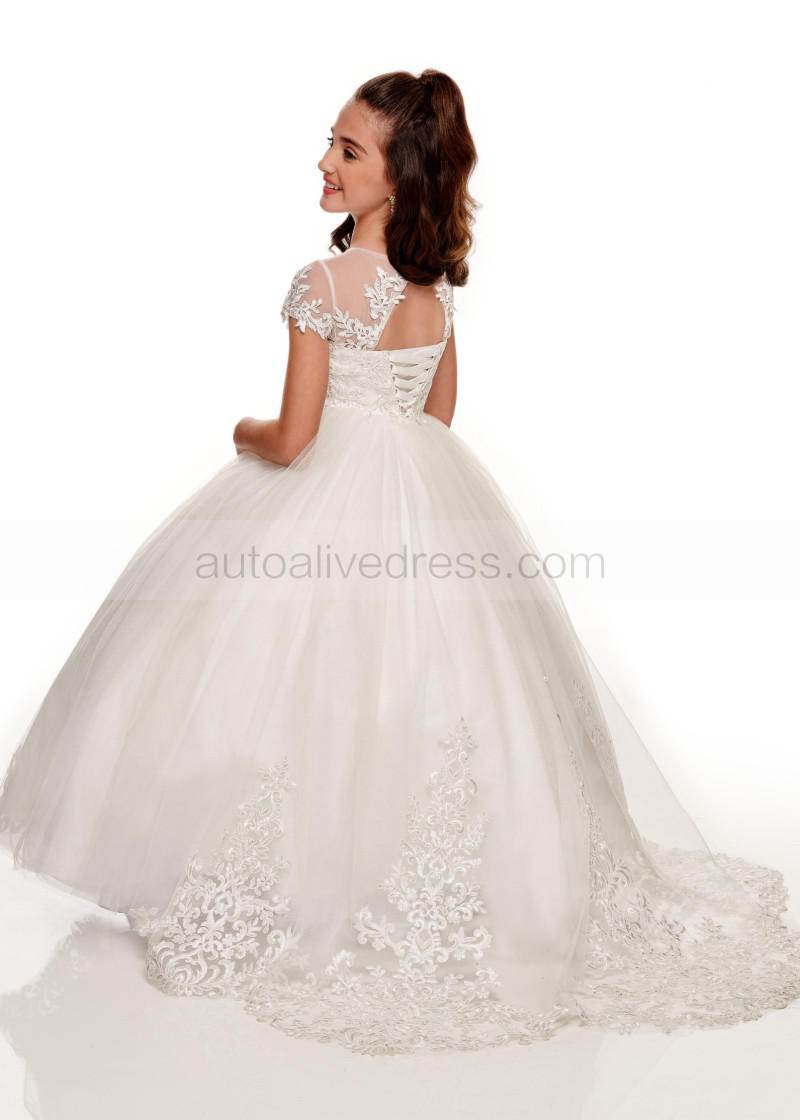 Short Sleeves Ivory Lace Tulle Latest Flower Girl Dress