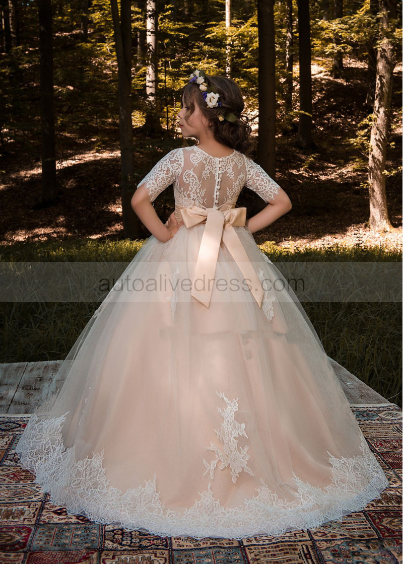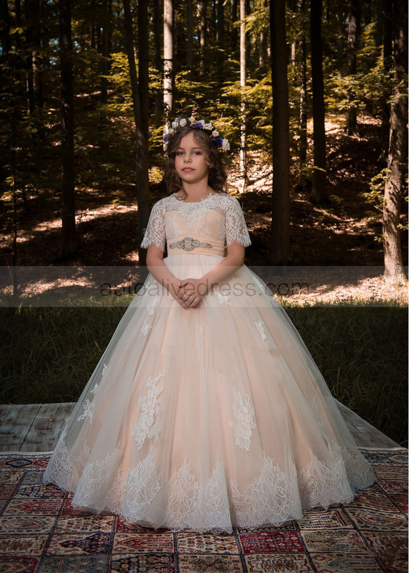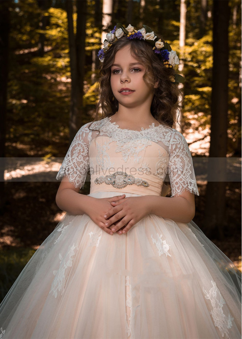 Short Sleeves Ivory Lace Tulle Long Flower Girl Dress With Beaded Sash