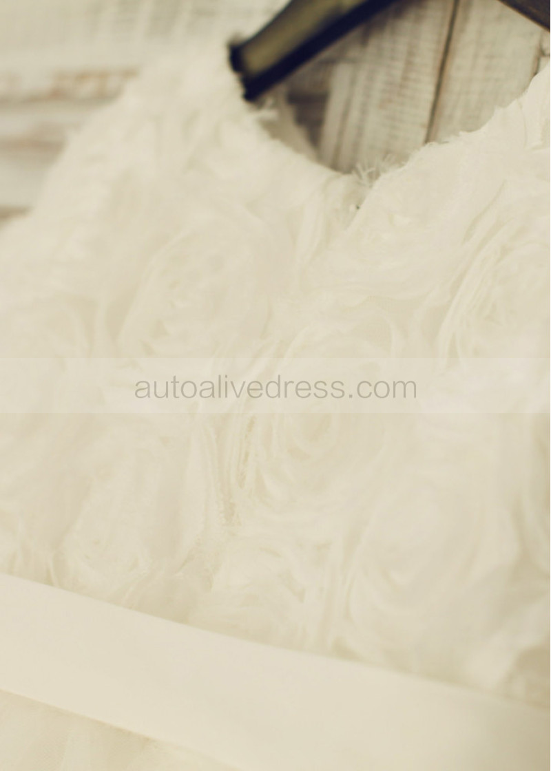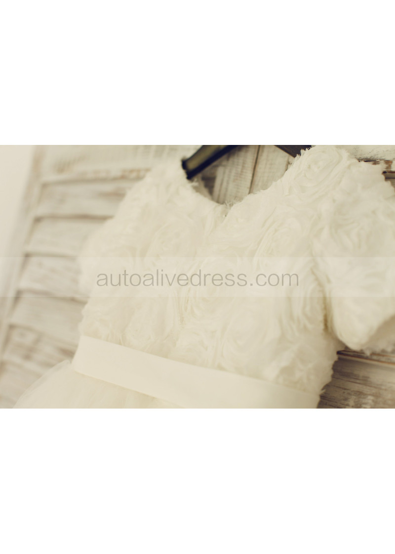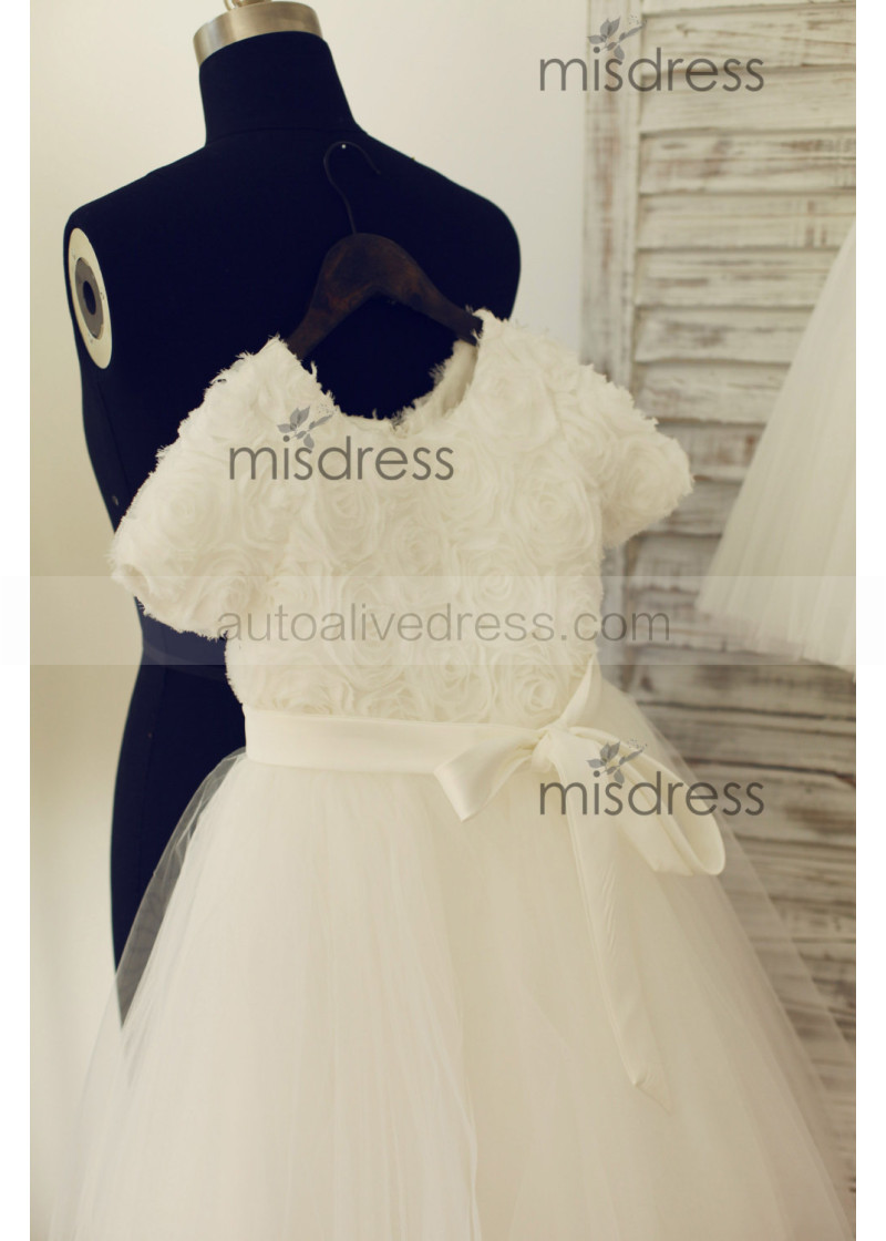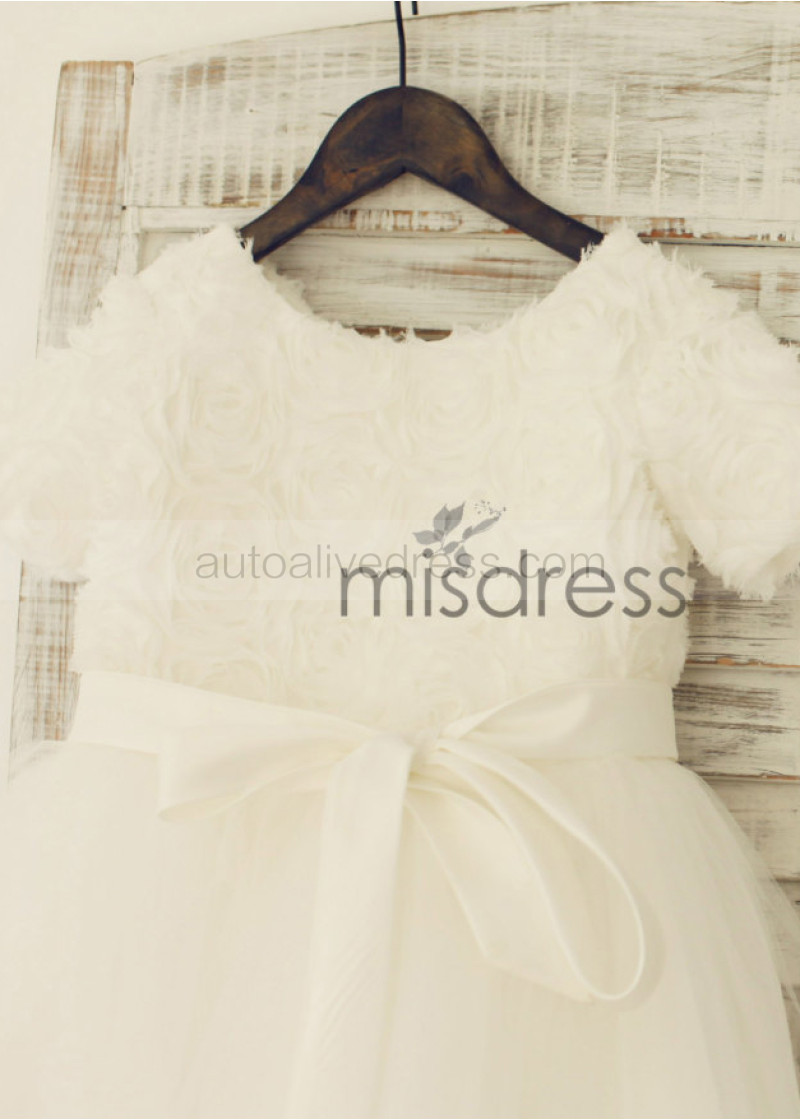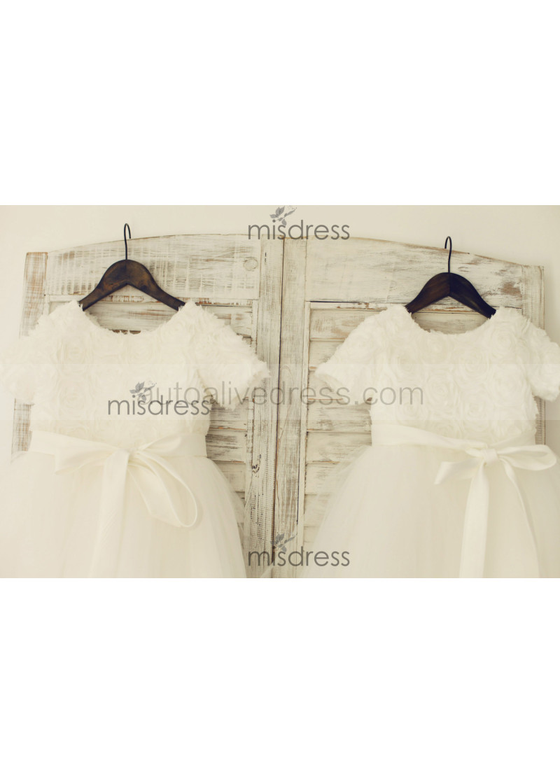 Short Sleeves Ivory Rosette Tulle Flower Girl Dress