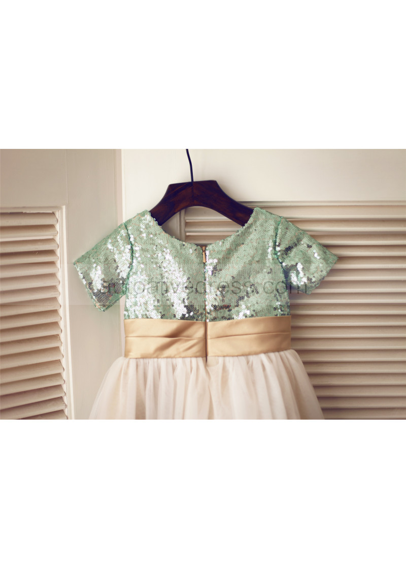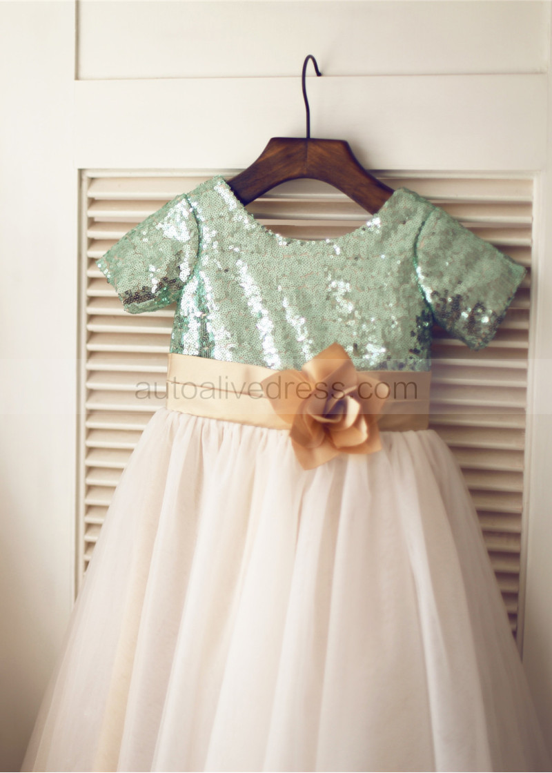 Short Sleeves Mint Sequin Ivory Tulle Floor Length Flower Girl Dress