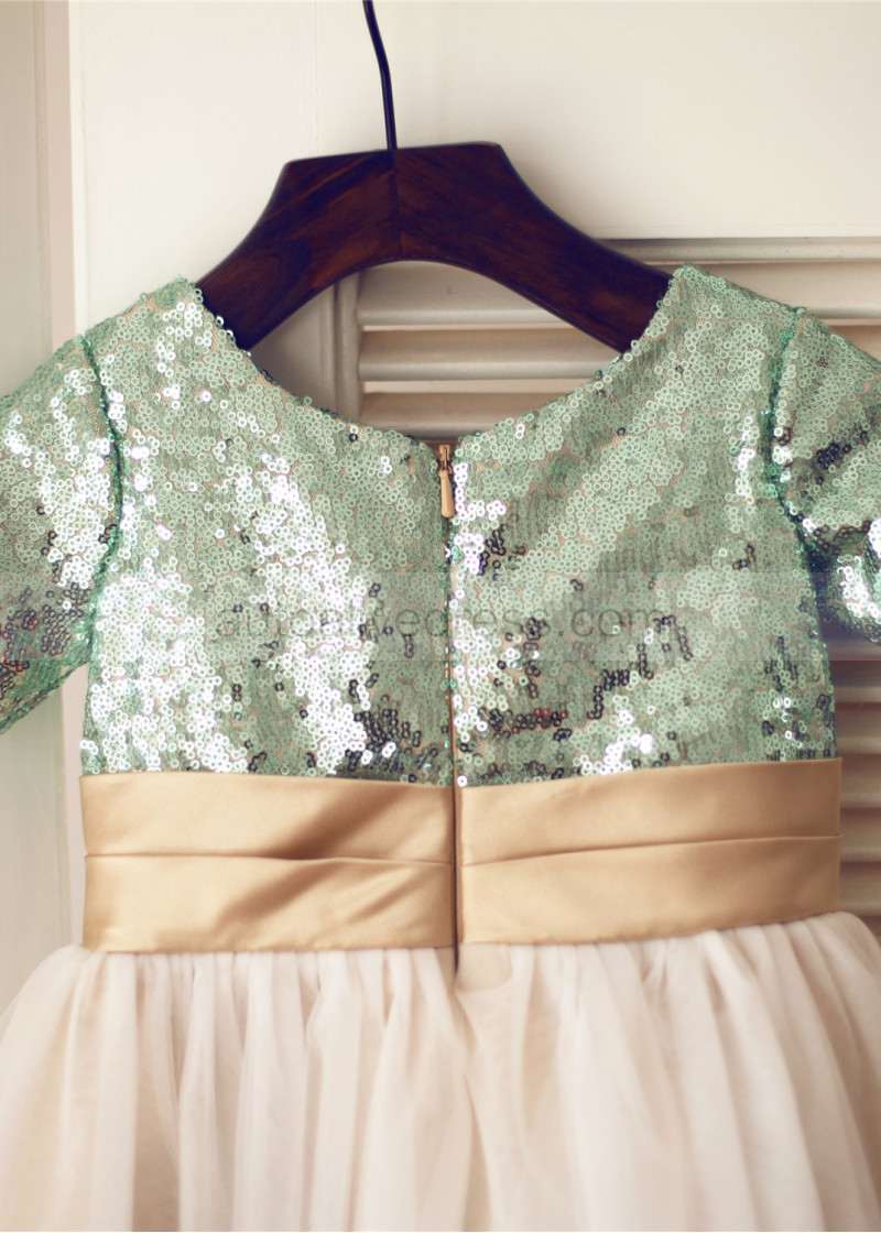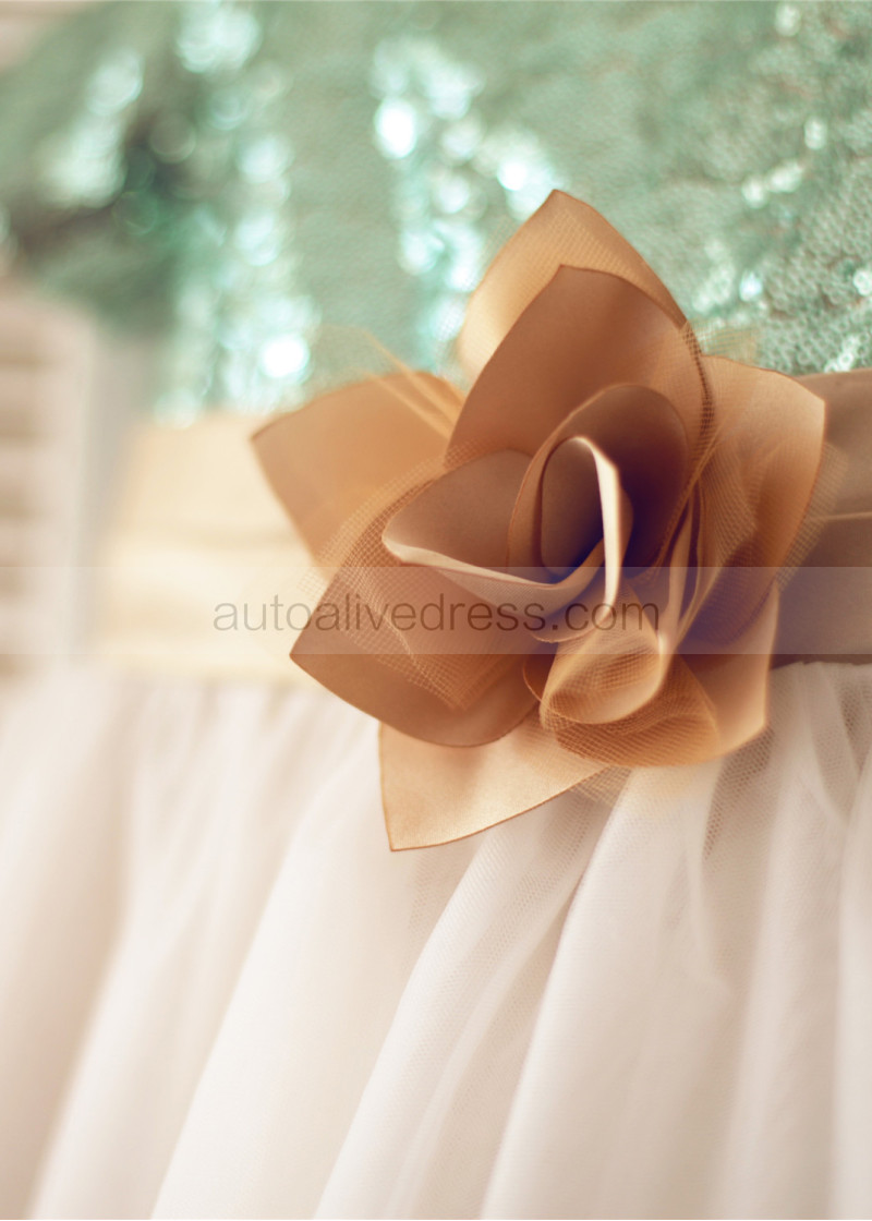 Shown Color | Mint Sequin, Ivory Tulle With Champagne Sash/Flower/Lining |