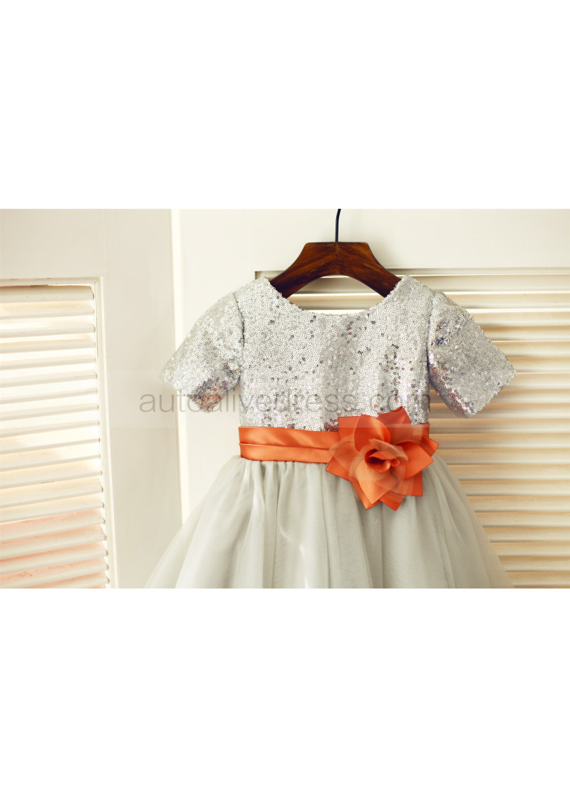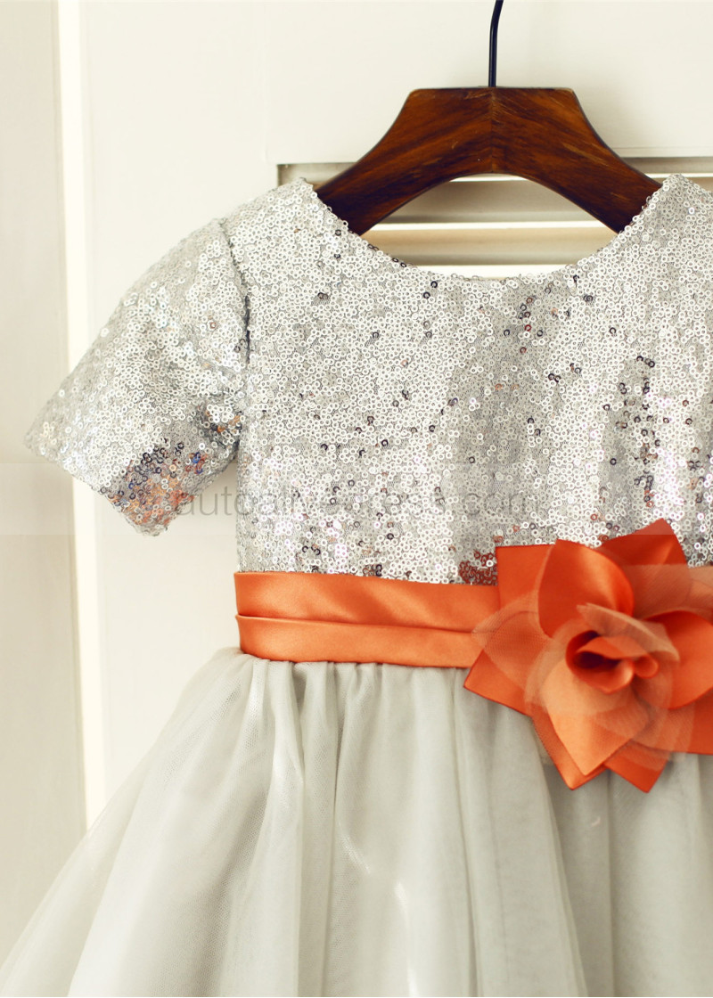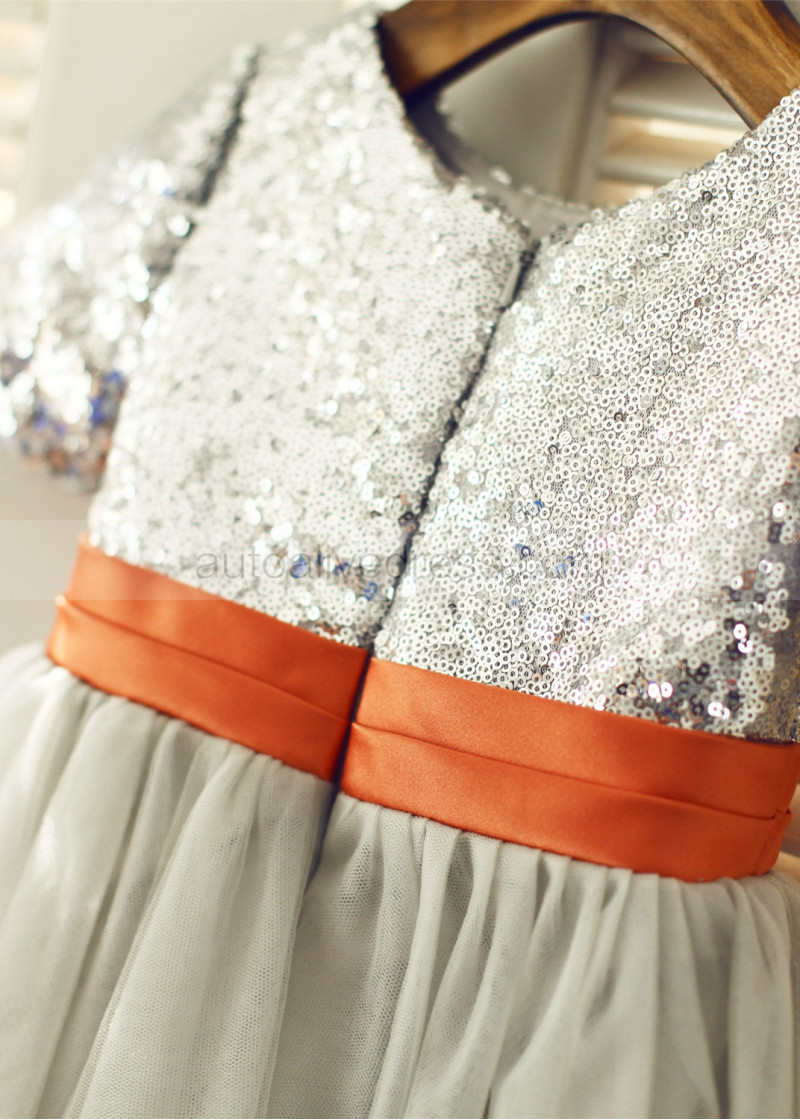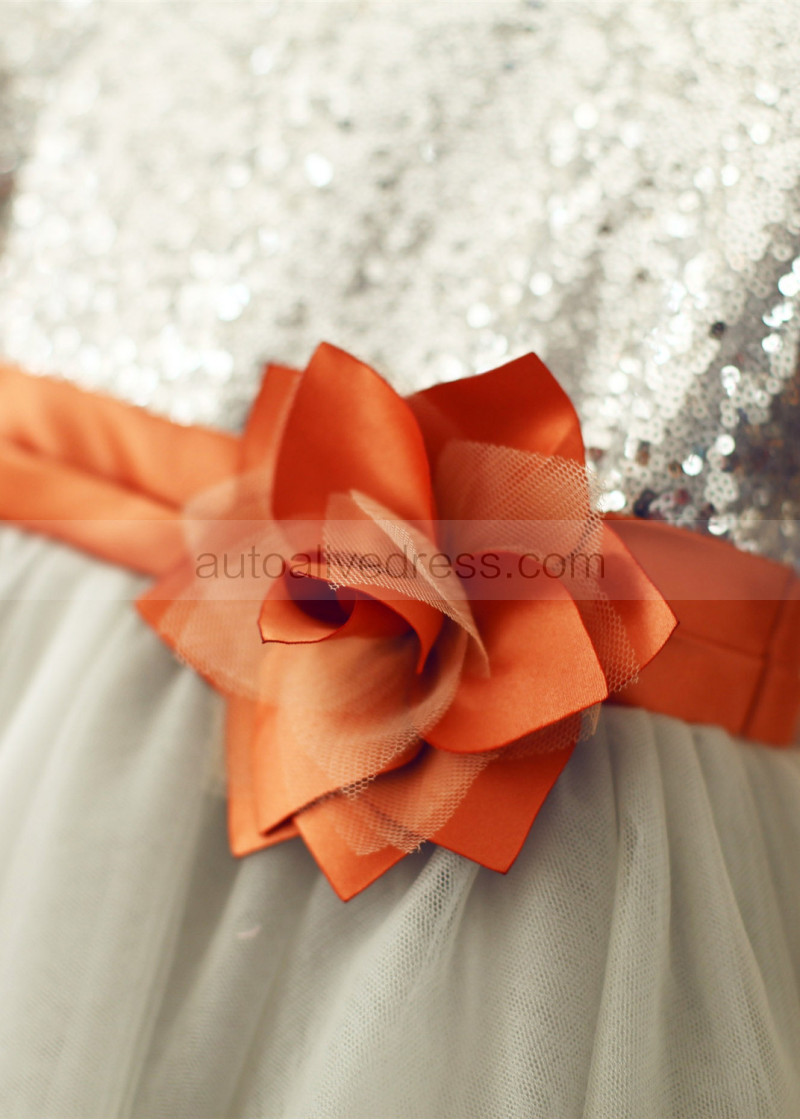 Shown Color | Silver Sequin, Gray Tulle With Burnt Orange Sash/Flower |