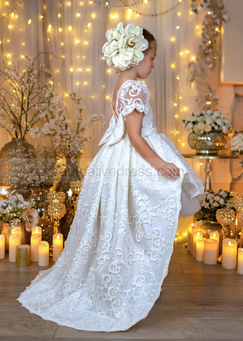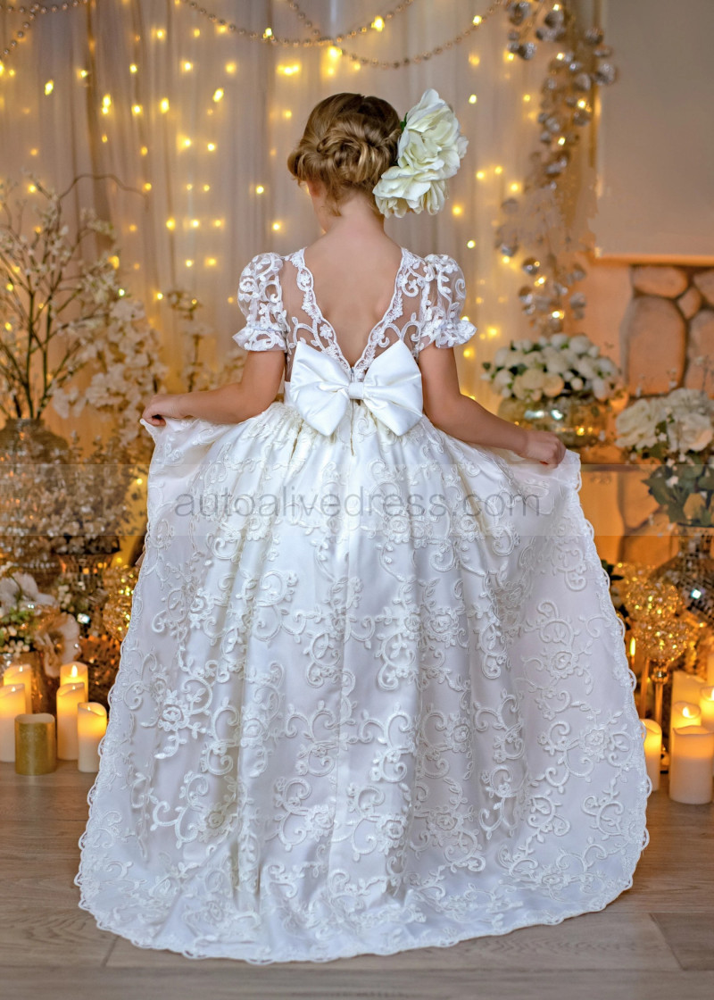 Short Sleeves White Lace Tulle High Low Flower Girl Dress