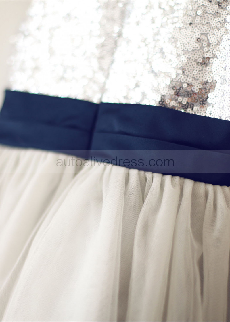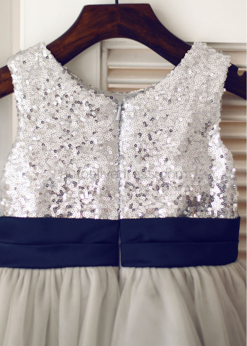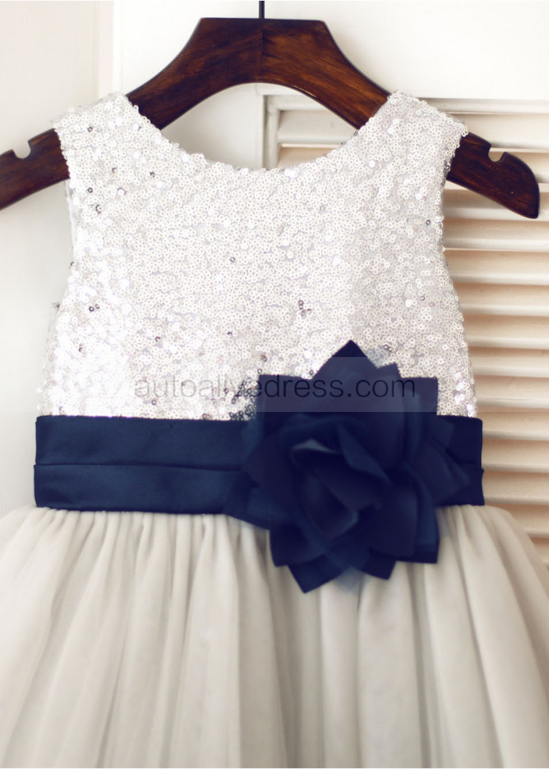 Shown Color | Silver Sequin, Gray Tulle With Navy Blue Sash/Flower |