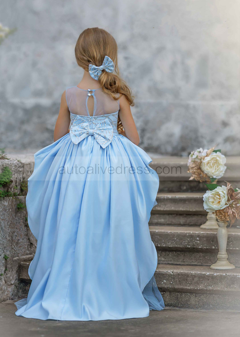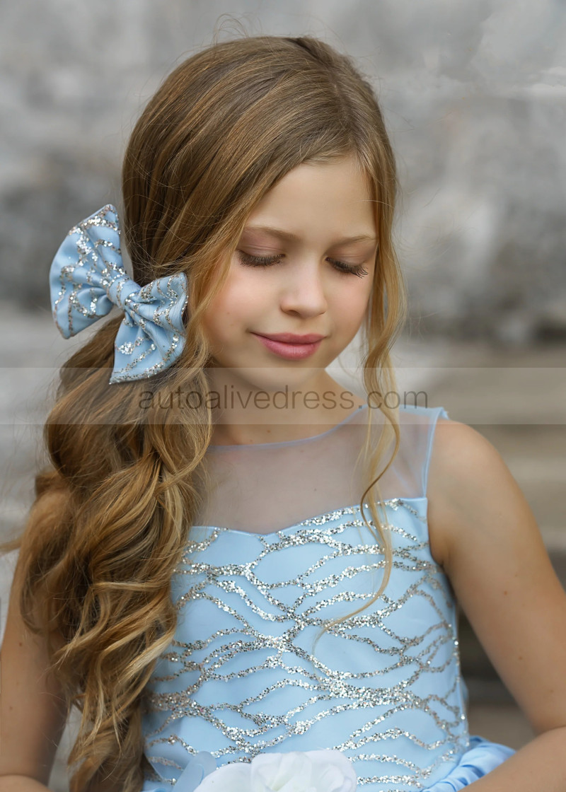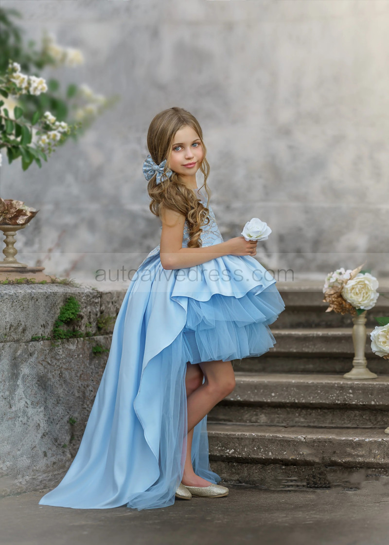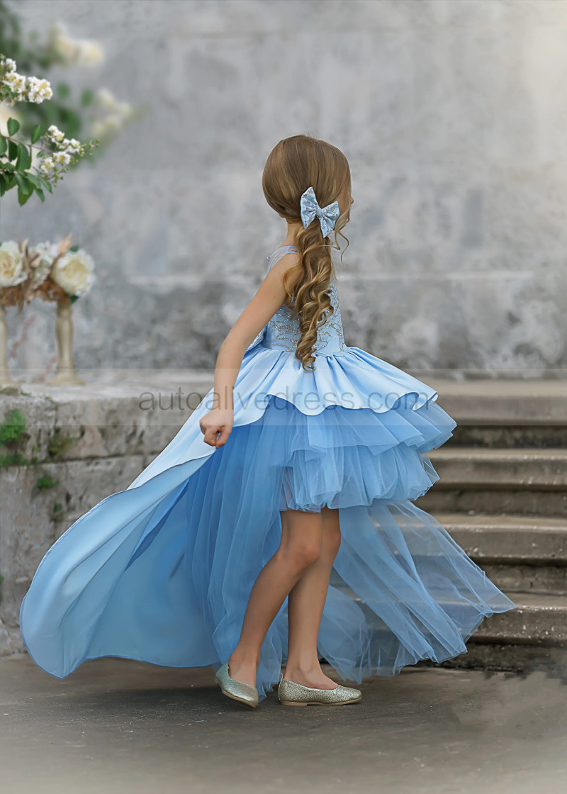 Sky Blue Glitter Tulle Slit Back High Low Flower Girl Dress