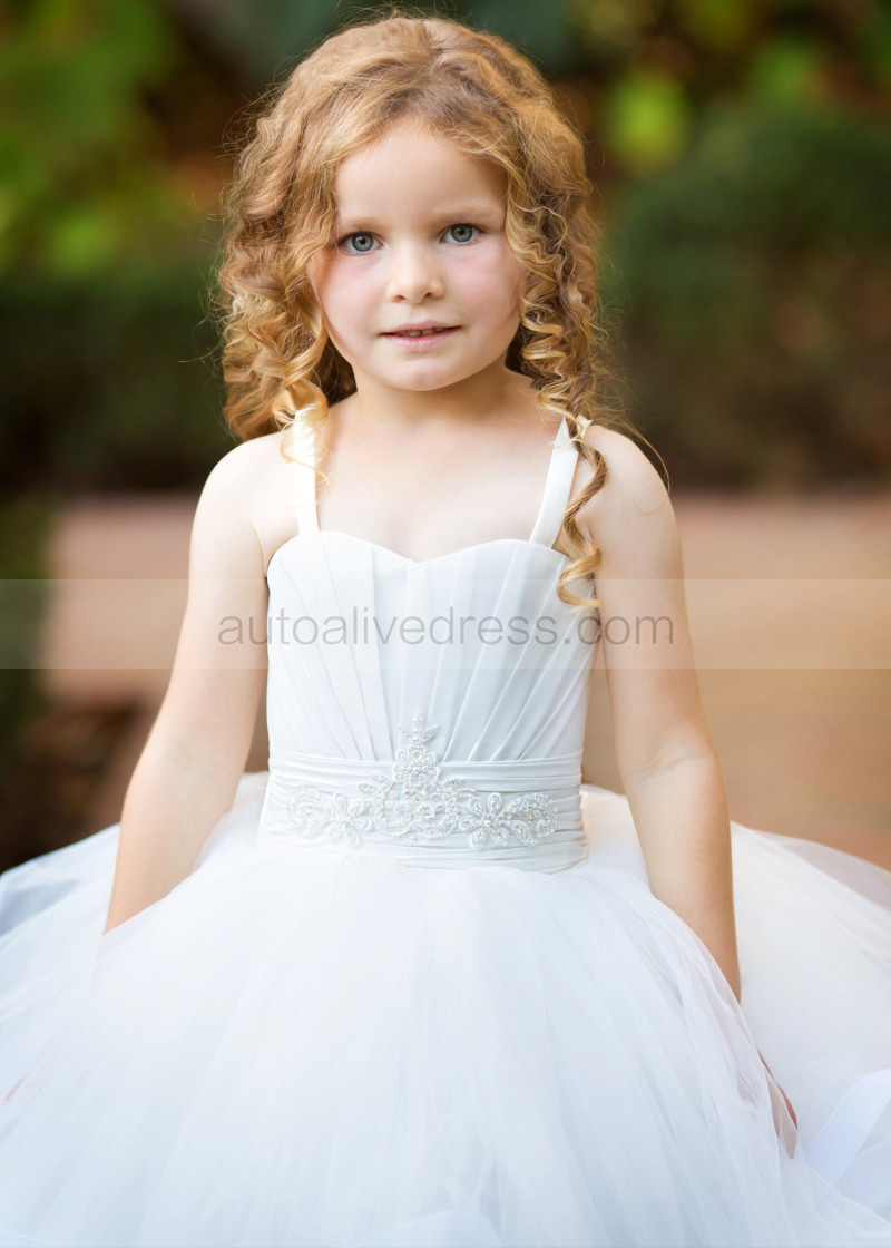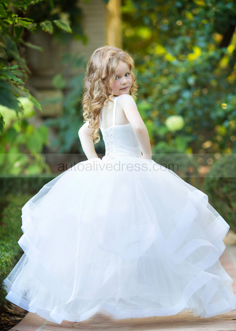 Spaghetti Straps White Tulle Ruffle Long Flower Girl Dress