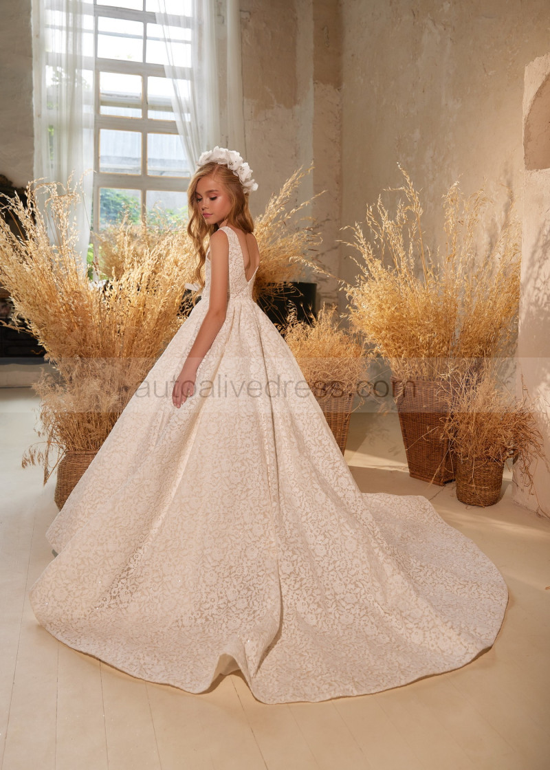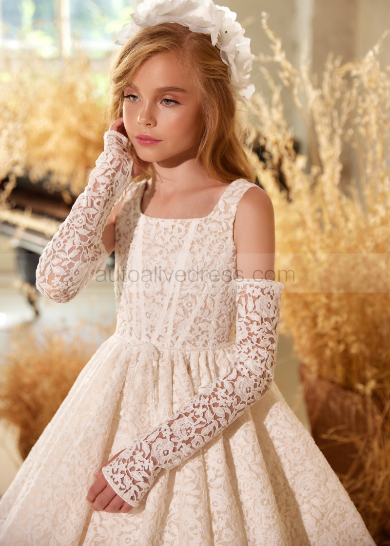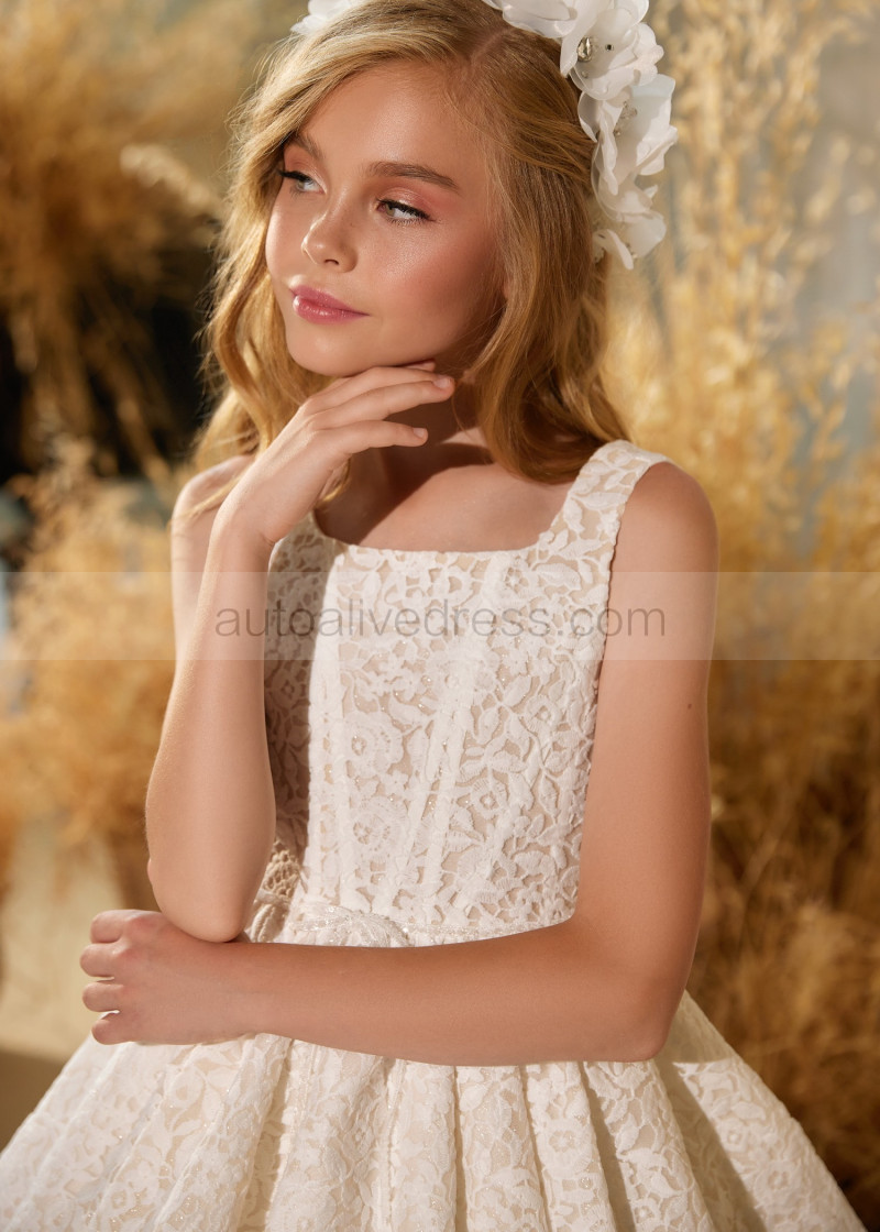 Square Neck Ivory Lace V Back Flower Girl Dress Photoshoot Dress