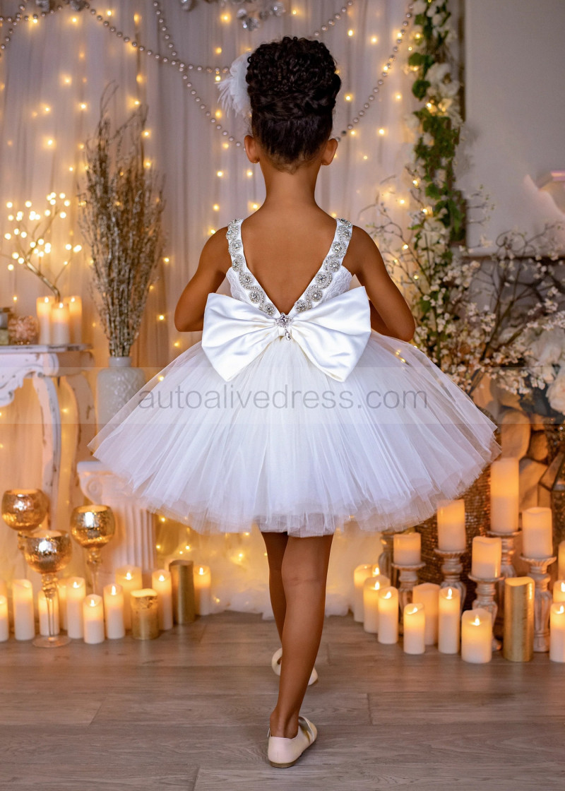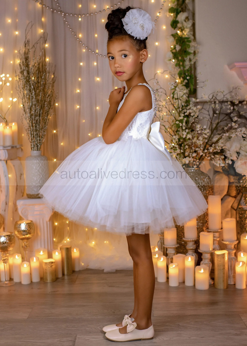 Sweetheart Neck White Lace Tulle Jeweled Trim Flower Girl Dress
