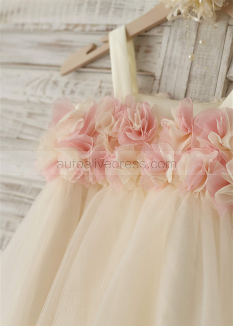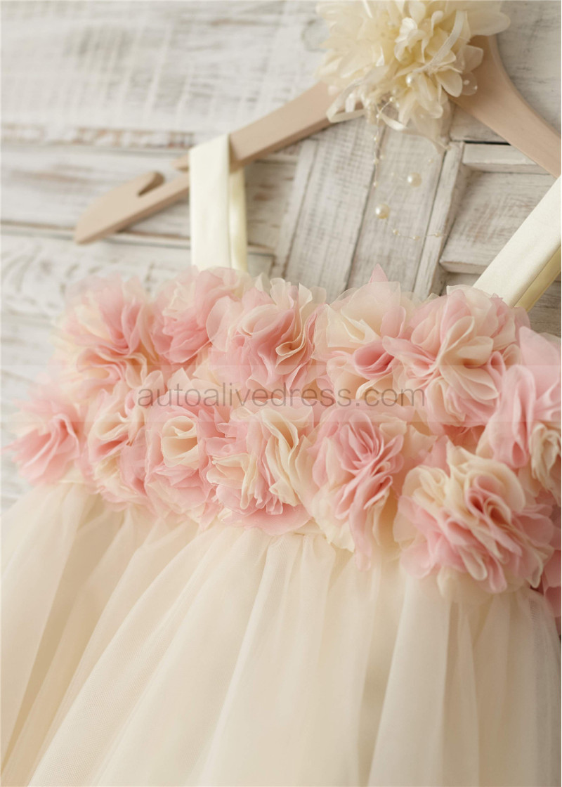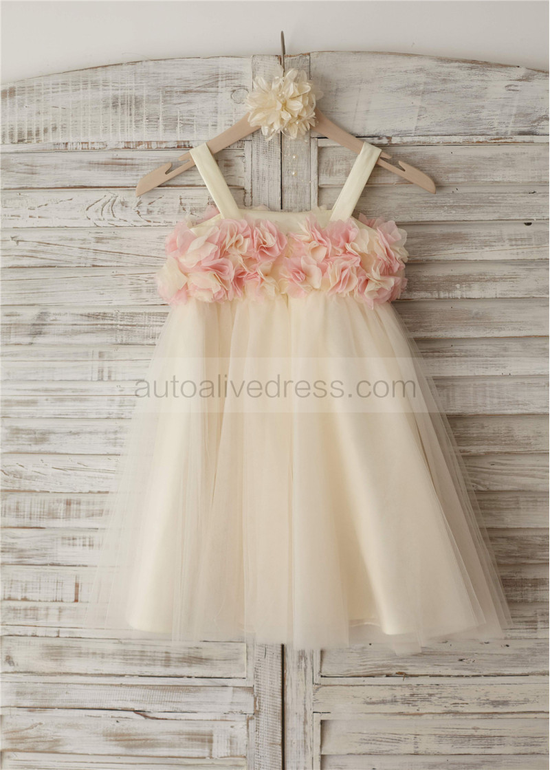 Thin Straps Champagne Tulle Floral Flower Girl Dress