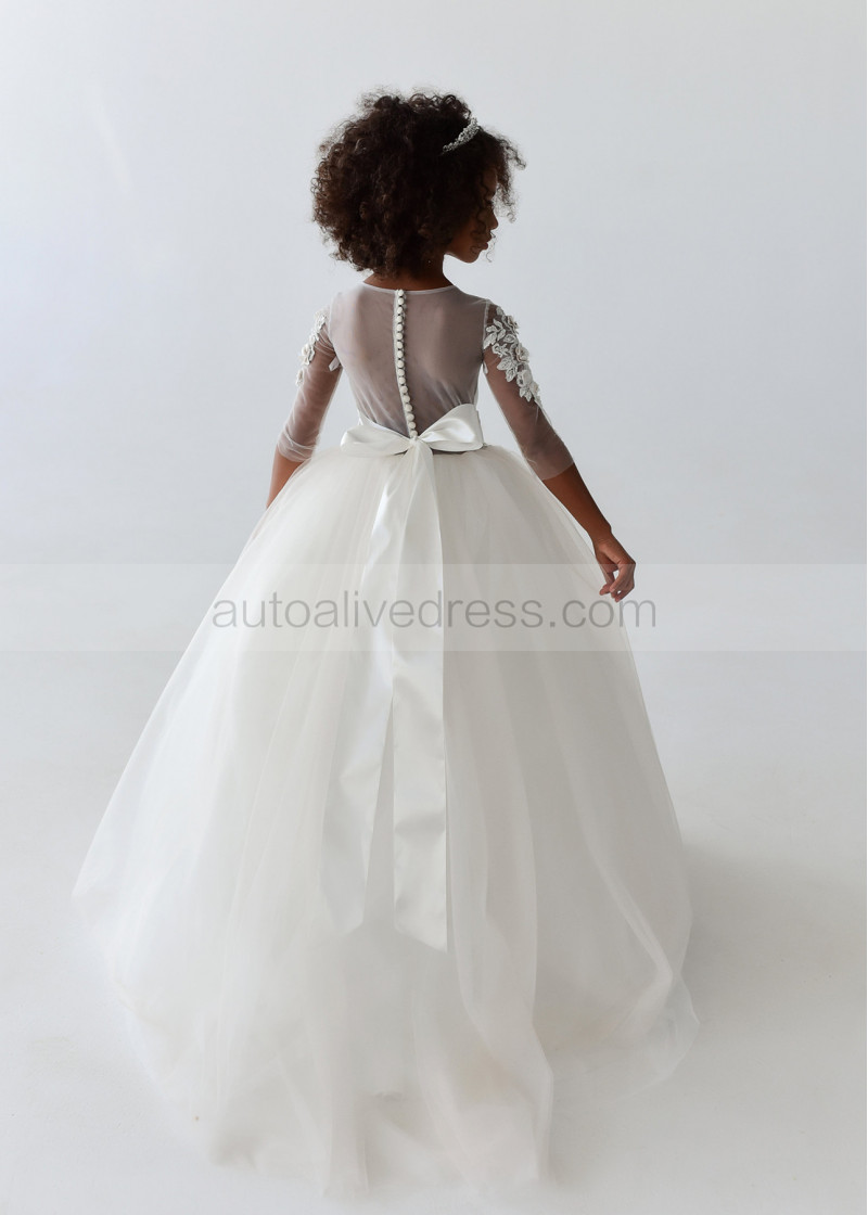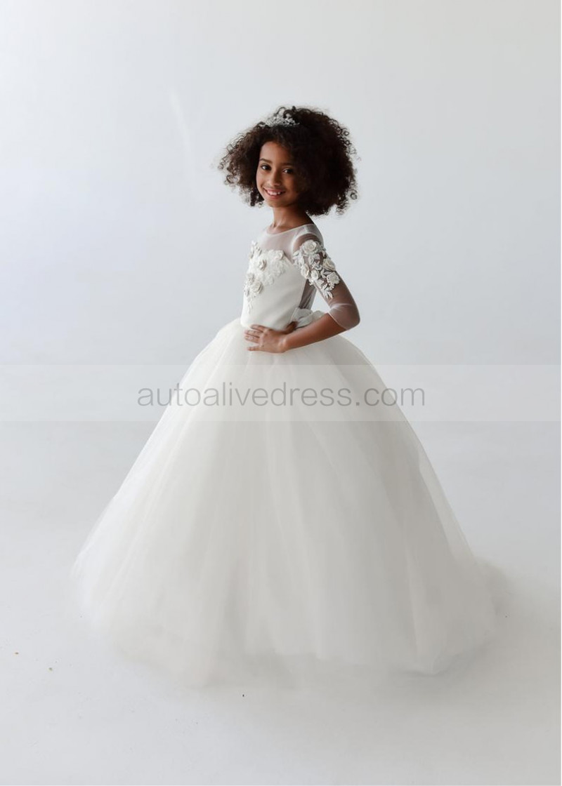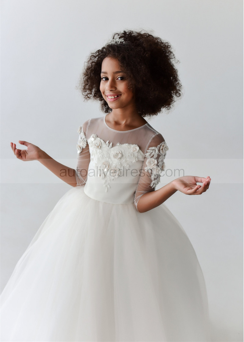 Three Quarter Sleeves Ivory 3D Lace Tulle Romantic Flower Girl Dress