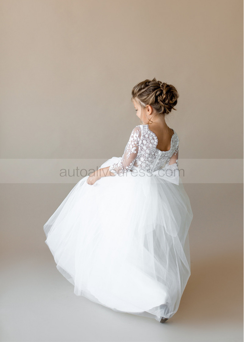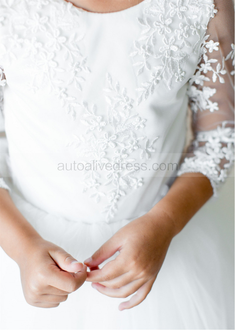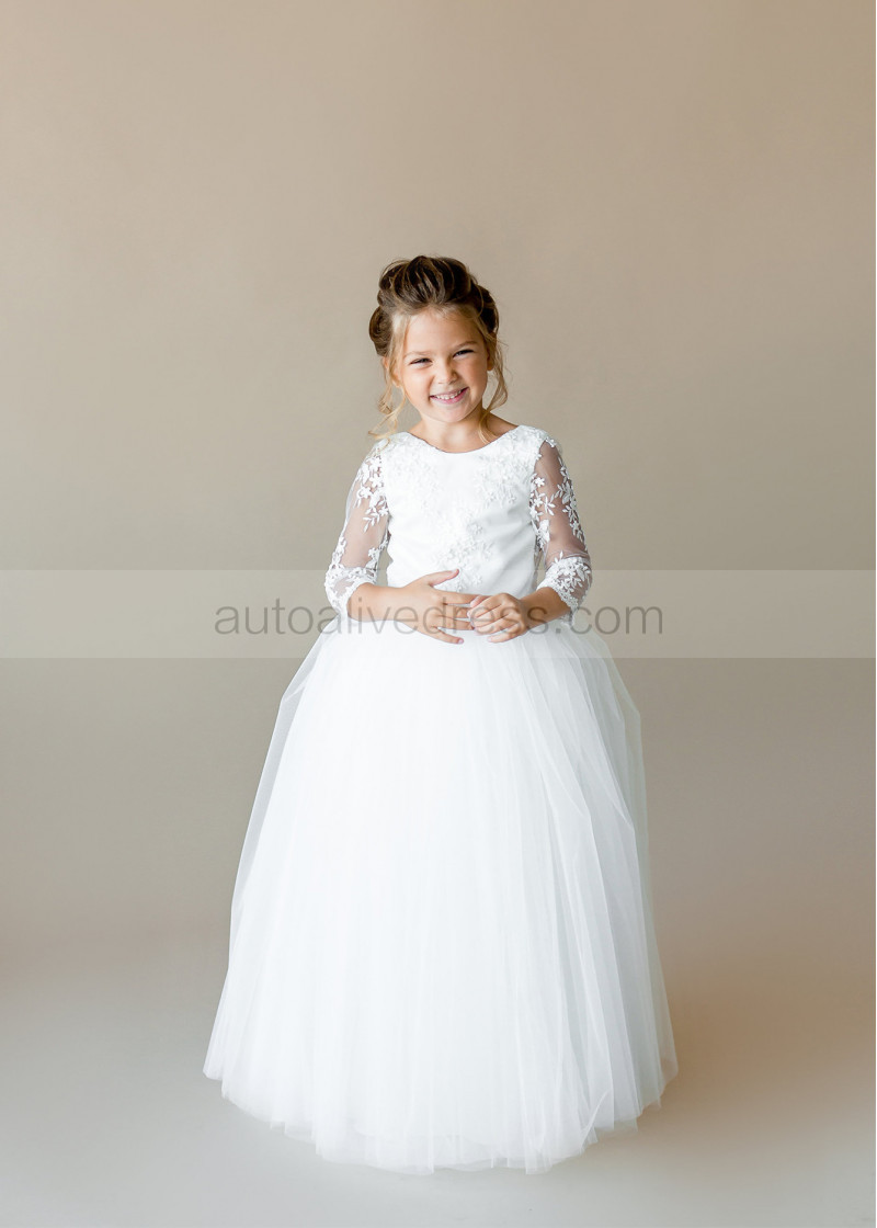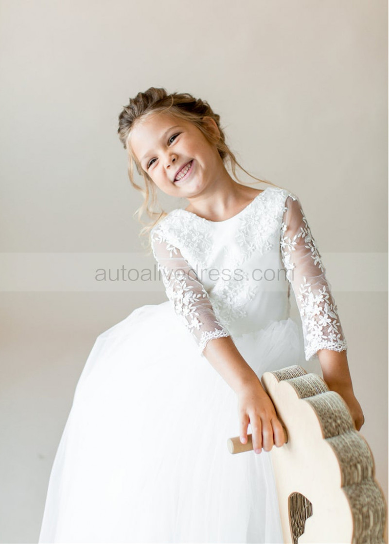 Three Quarter Sleeves Ivory Lace Tulle Sheer Back Flower Girl Dress