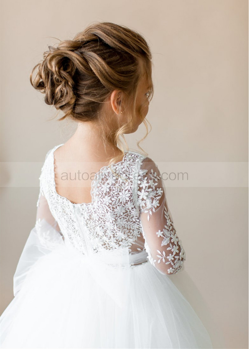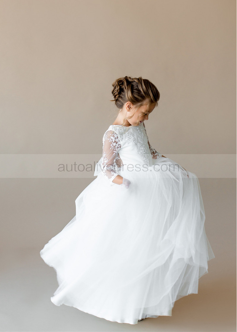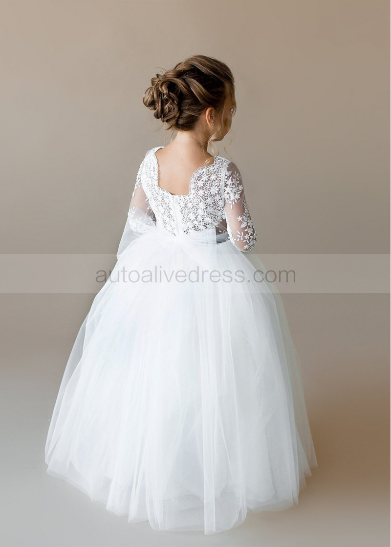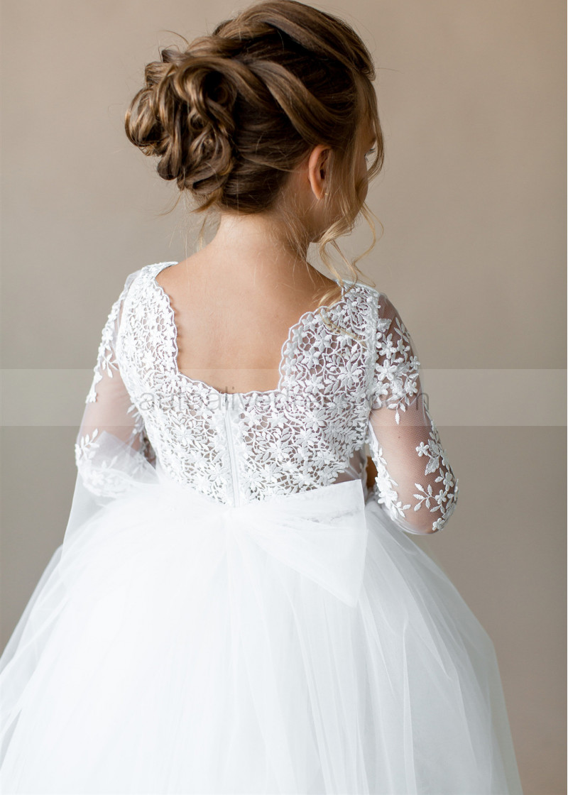 Three Quarter Sleeves Ivory Lace Tulle Sheer Back Flower Girl Dress