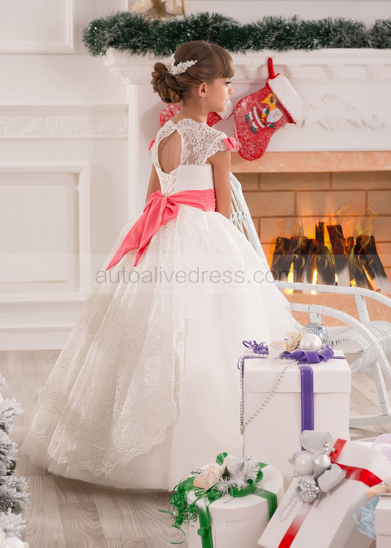 V Neck Ivory Lace Tulle Flower Girl Dress With Coral Bows