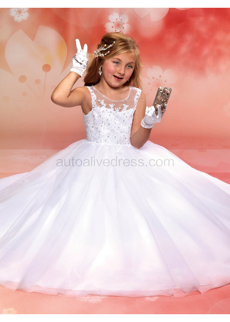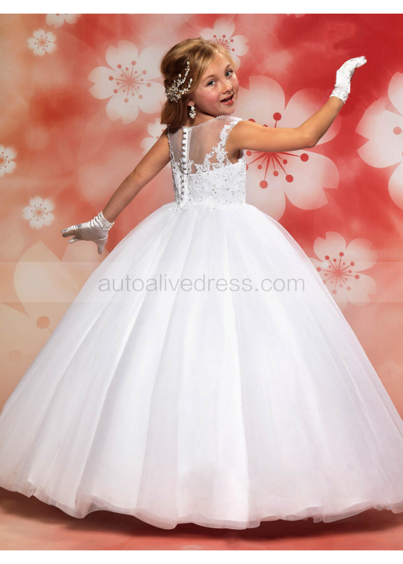 White Beaded Lace Tulle Floor Length Flower Girl Dress First Communion Dress