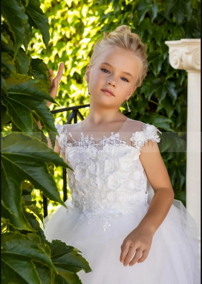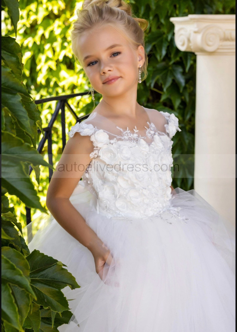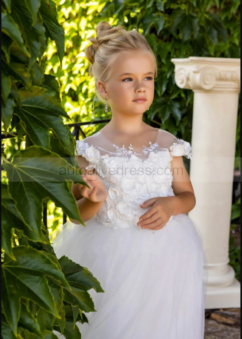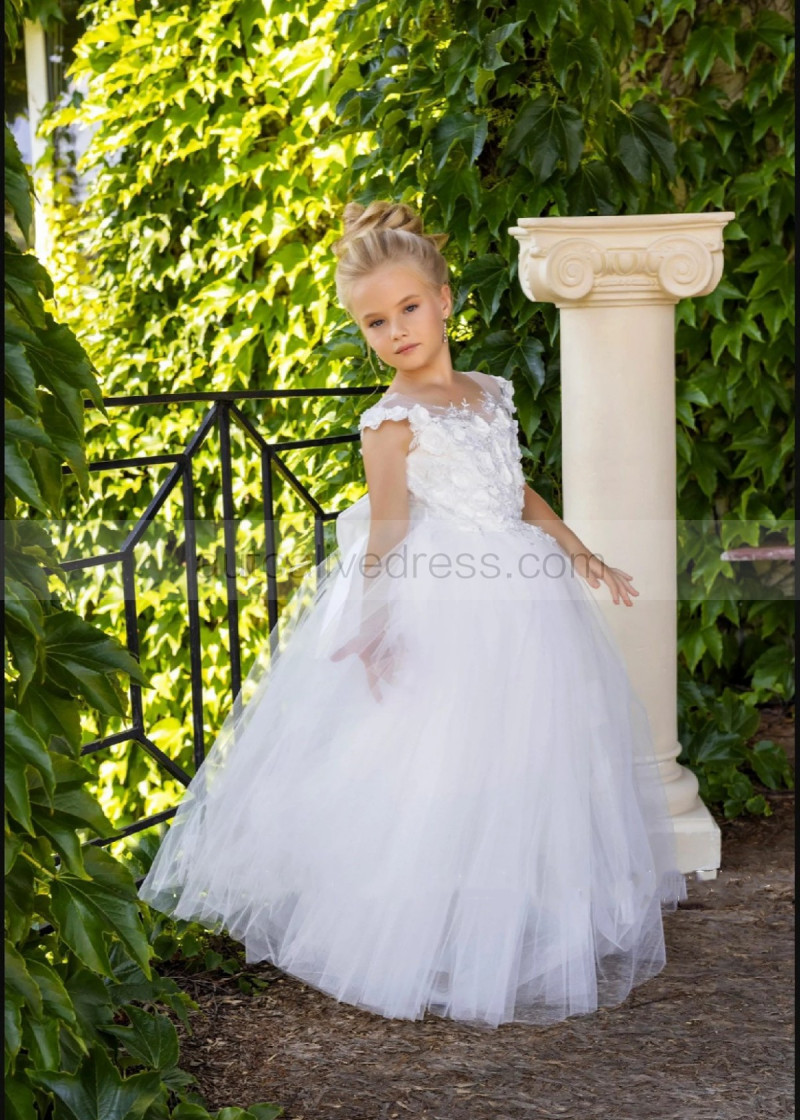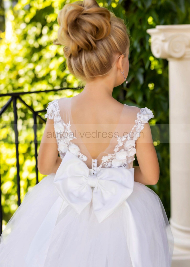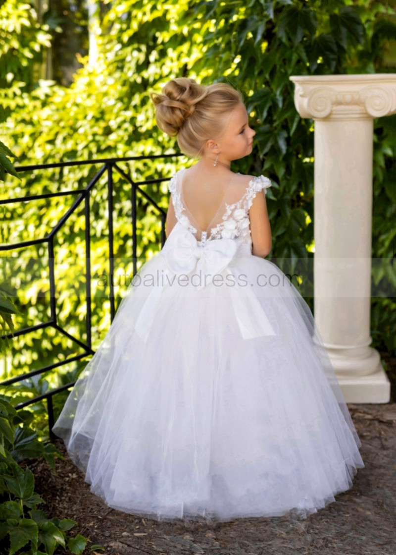 White Floral Lace Tulle V Back Long Flower Girl Dress