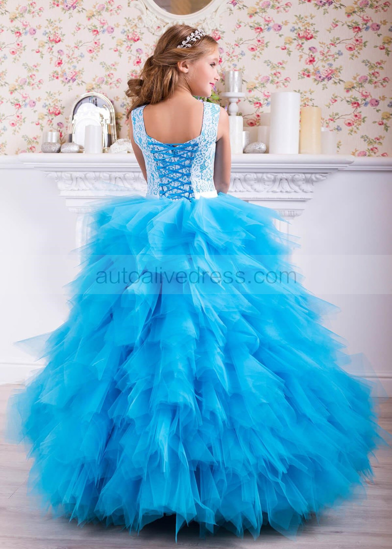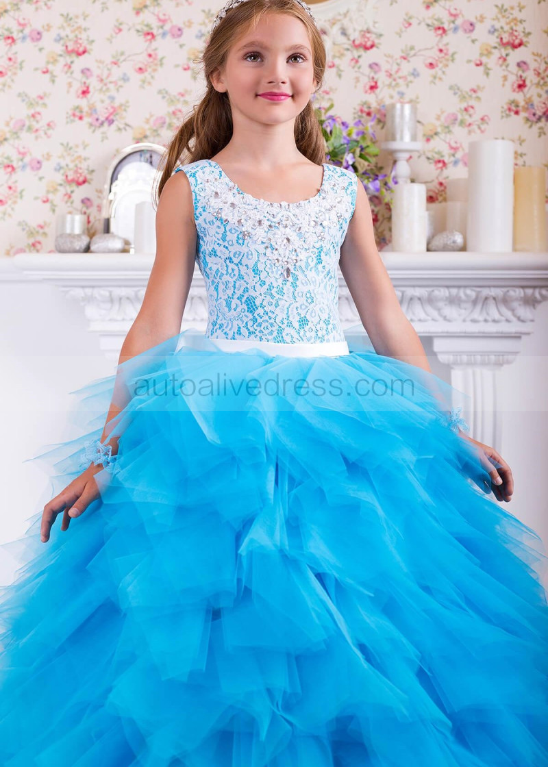 White Lace Blue Tulle Ruffled Floor Length Flower Girl Dress