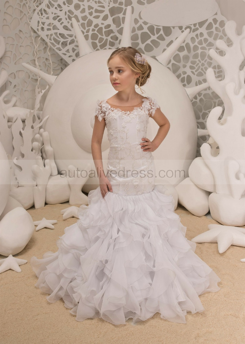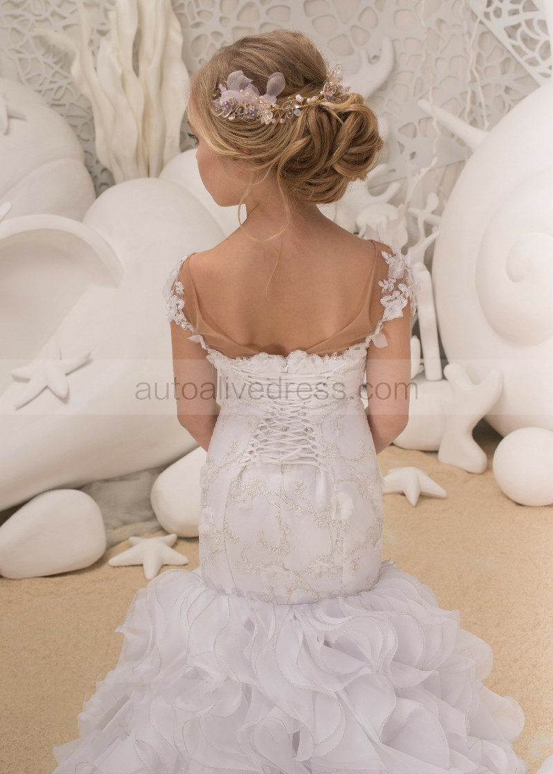 White Lace Organza Corset Back Long Flower Girl Dress