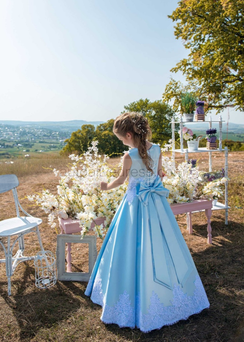 White Lace Sky Blue Satin Box Pleated Classic Flower Girl Dress