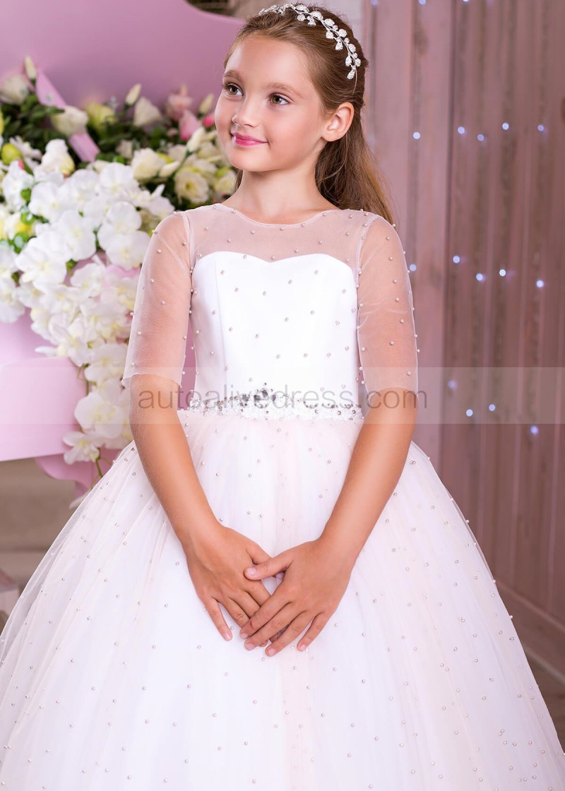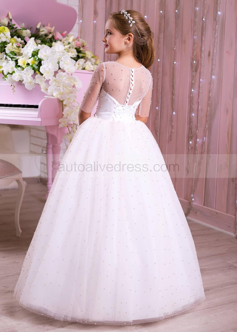 White Pearls Tulle Buttons Back Long Flower Girl Dress