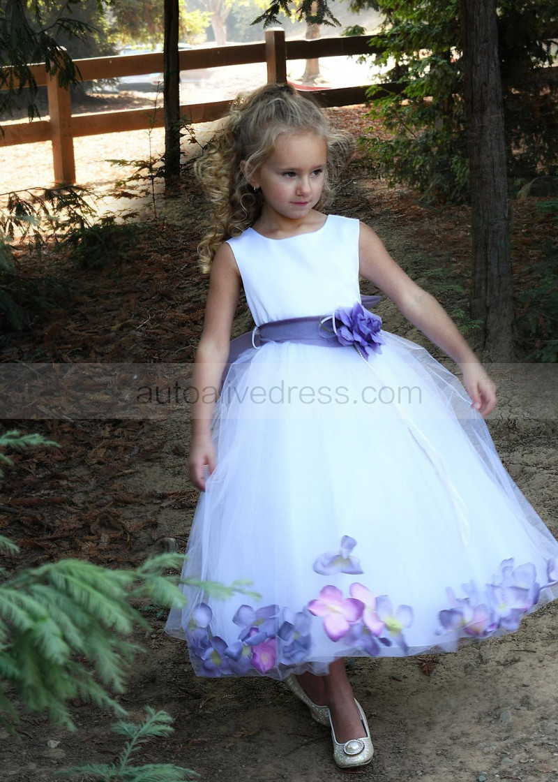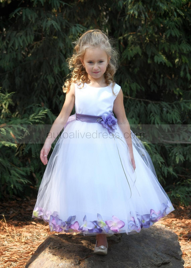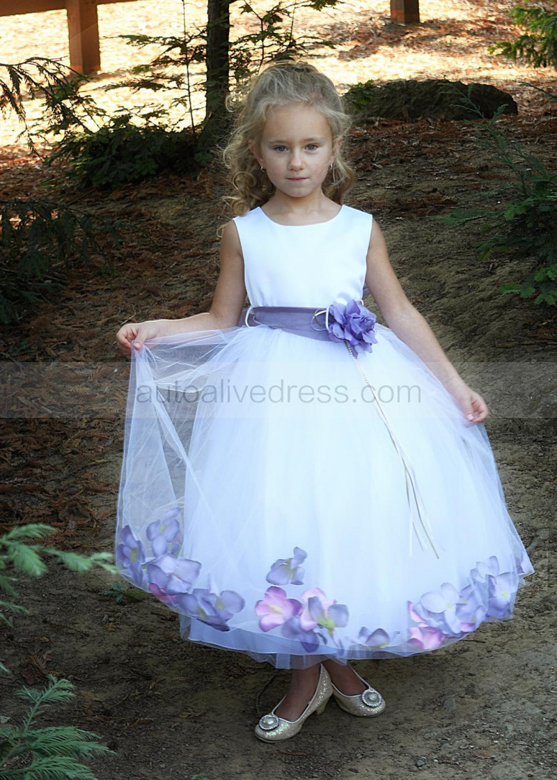 White Satin Tulle Purple Petals Tea Length Flower Girl Dress